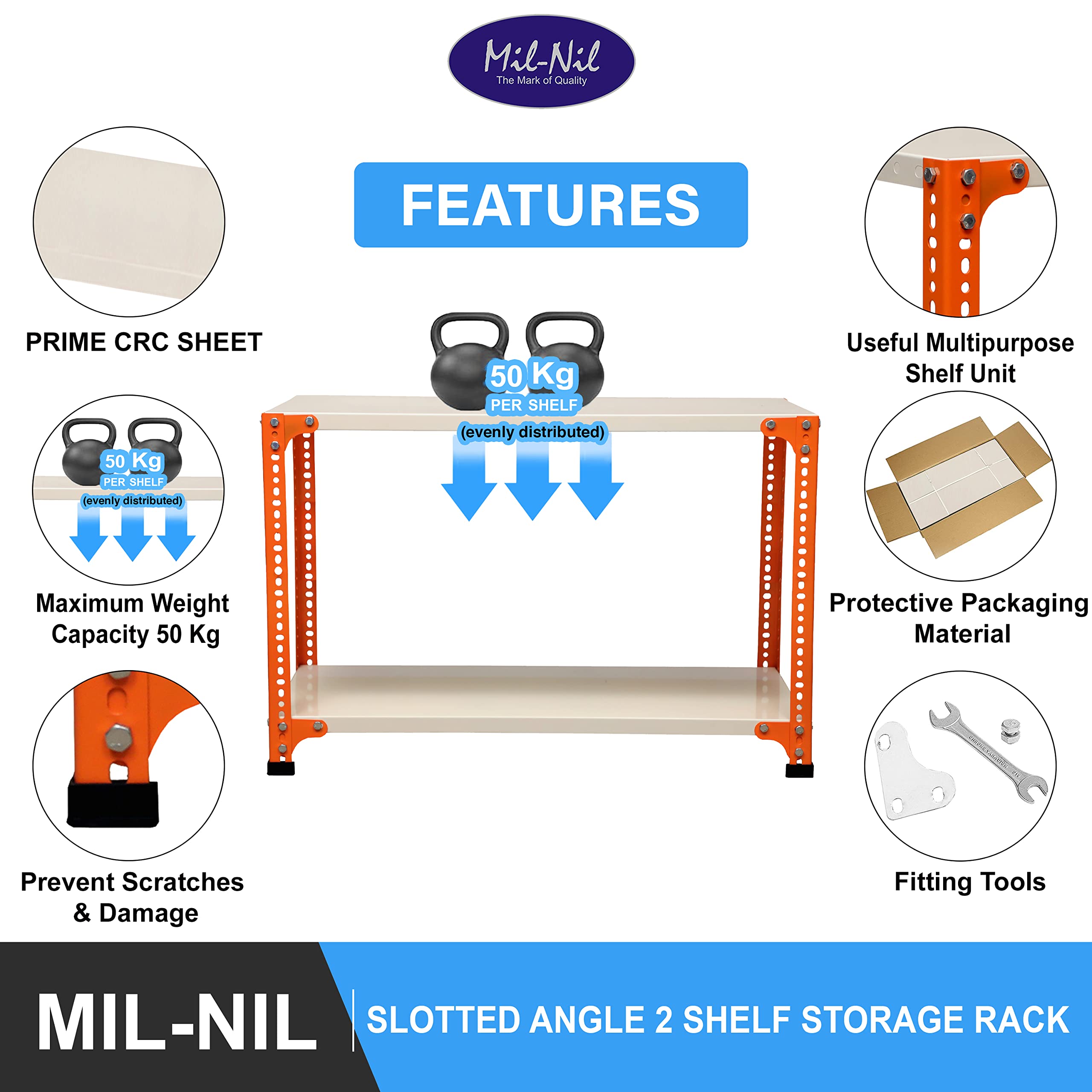 Item NameMil-Nil Prime CRC Sheet 2 Shelf 22 Gauge Multipurpose Slotted Angle Rack | Adjustable Shelf Hight Powder Coated Rack for Home & Kitchen (24x36x15 Inch, 7.8 Kg, Orange/Ivory) 16 Gauge Angles