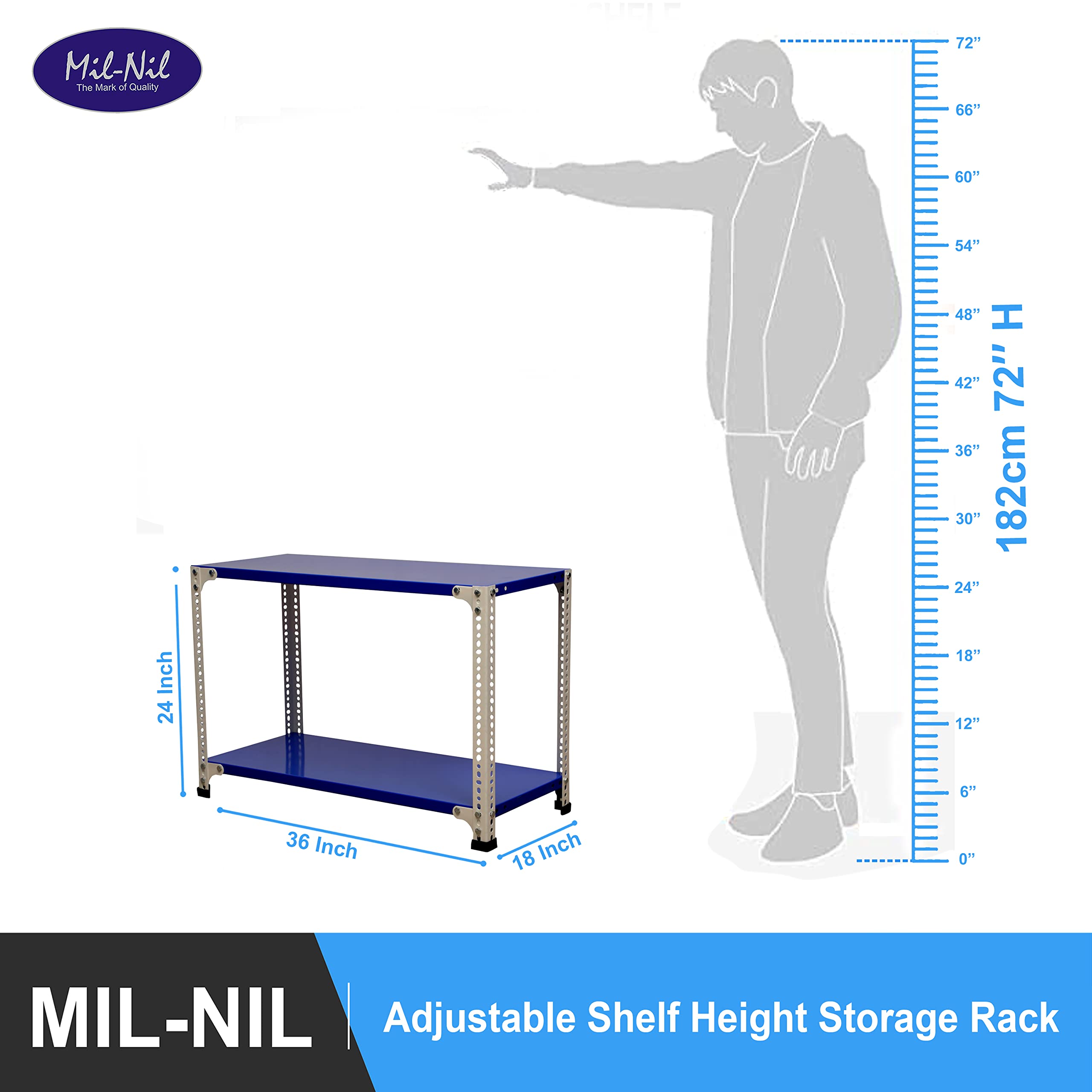 Item NameMil-Nil Prime CRC Sheet 2 Shelf 22 Gauge Multipurpose Slotted Angle Rack | Adjustable Shelf Hight Powder Coated Rack for Home & Kitchen (24x36x18 Inch, 8.6 Kg, Blue/White) 16 Gauge Angles
