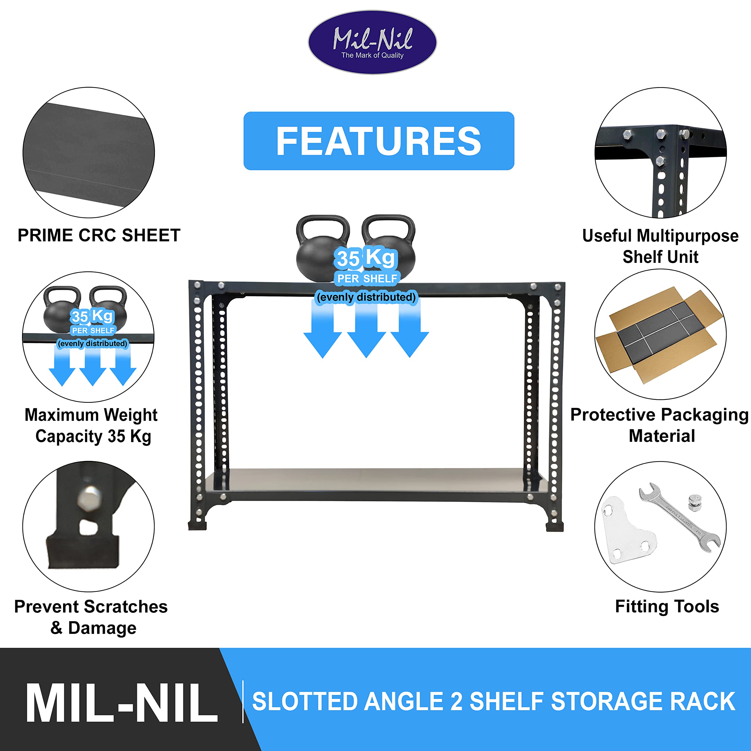 Item NameMil-Nil Prime CRC Sheet 2 Shelf 24 Gauge Multipurpose Slotted Angle Rack | Adjustable Shelf Hight Rack for Home & Kitchen (24x36x18 Inch, 8 Kg, Grey) 16 Gauge Angles