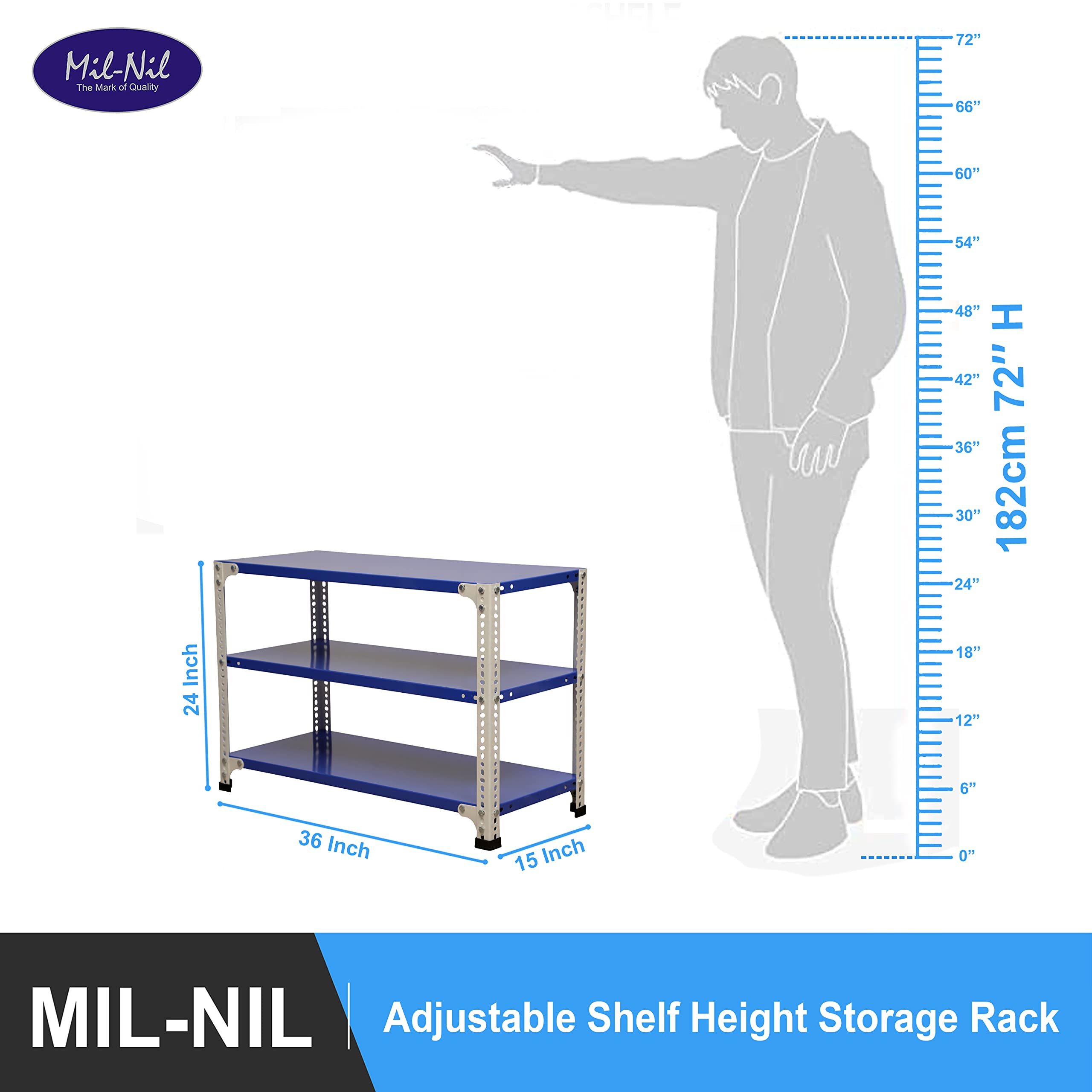 Item NameMil-Nil Prime CRC Sheet 3 Shelf 22 Gauge Multipurpose Slotted Angle Rack | Adjustable Shelf Hight Powder Coated Rack for Home & Kitchen (24x36x15 Inch, 10.2 Kg, Blue/White) 16 Gauge Angles