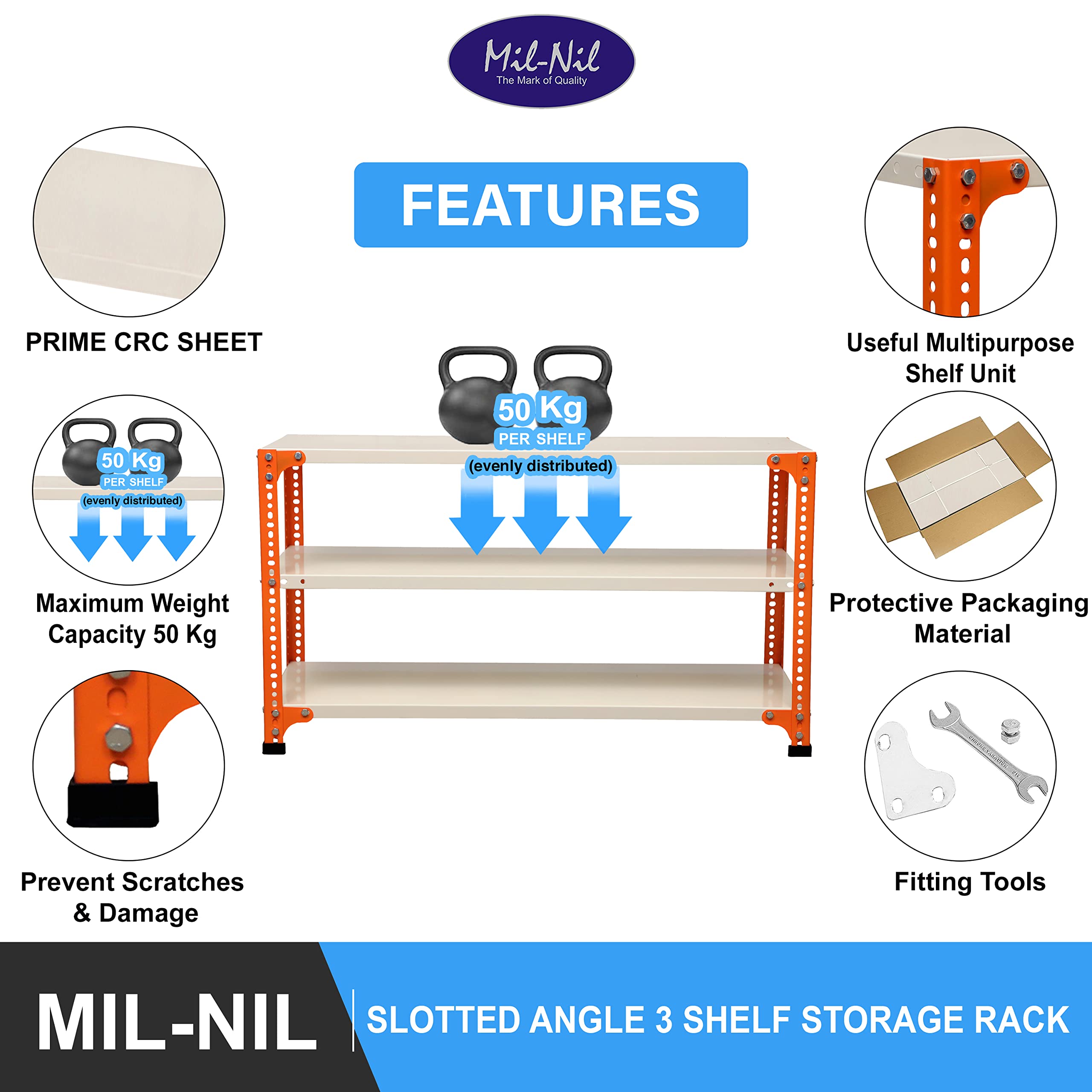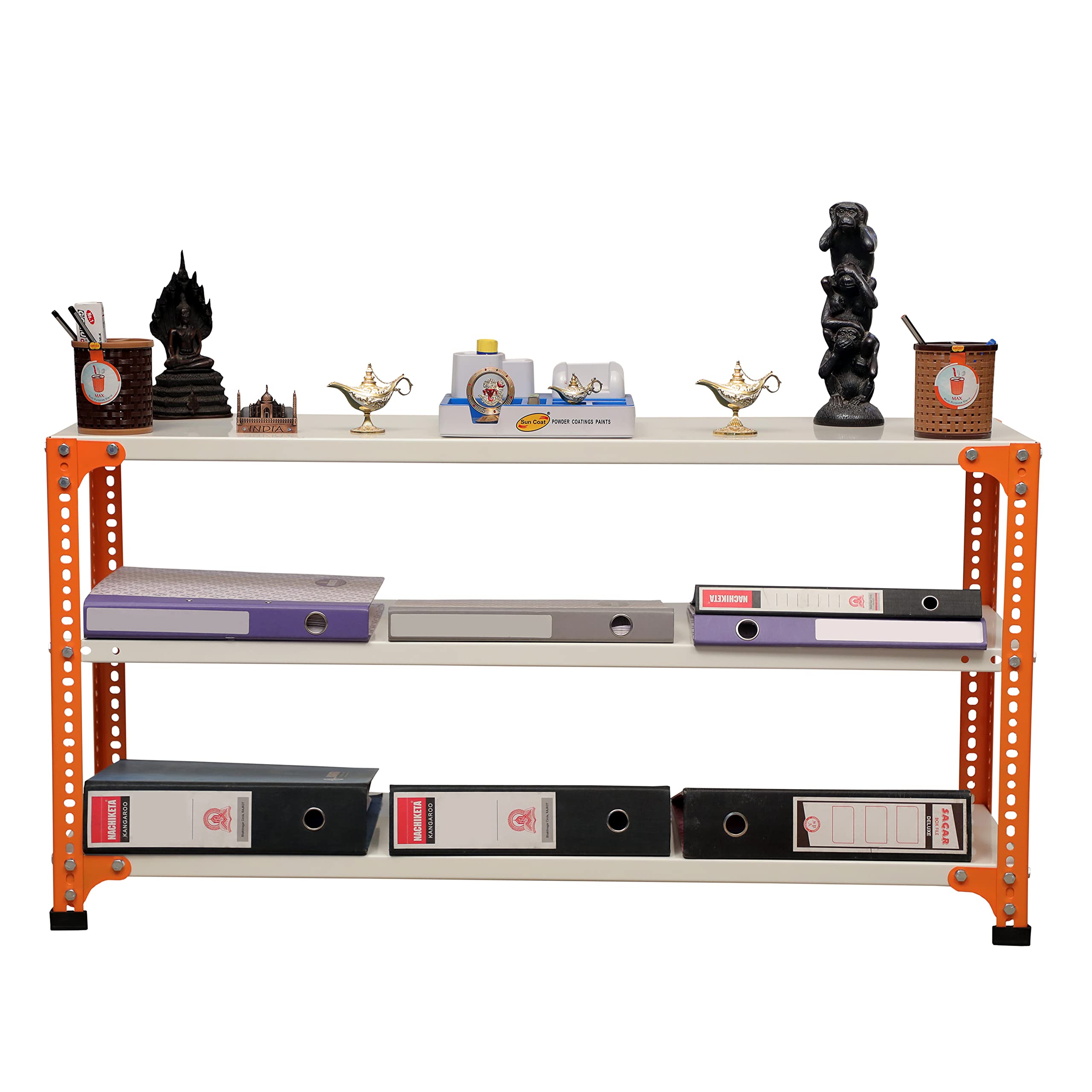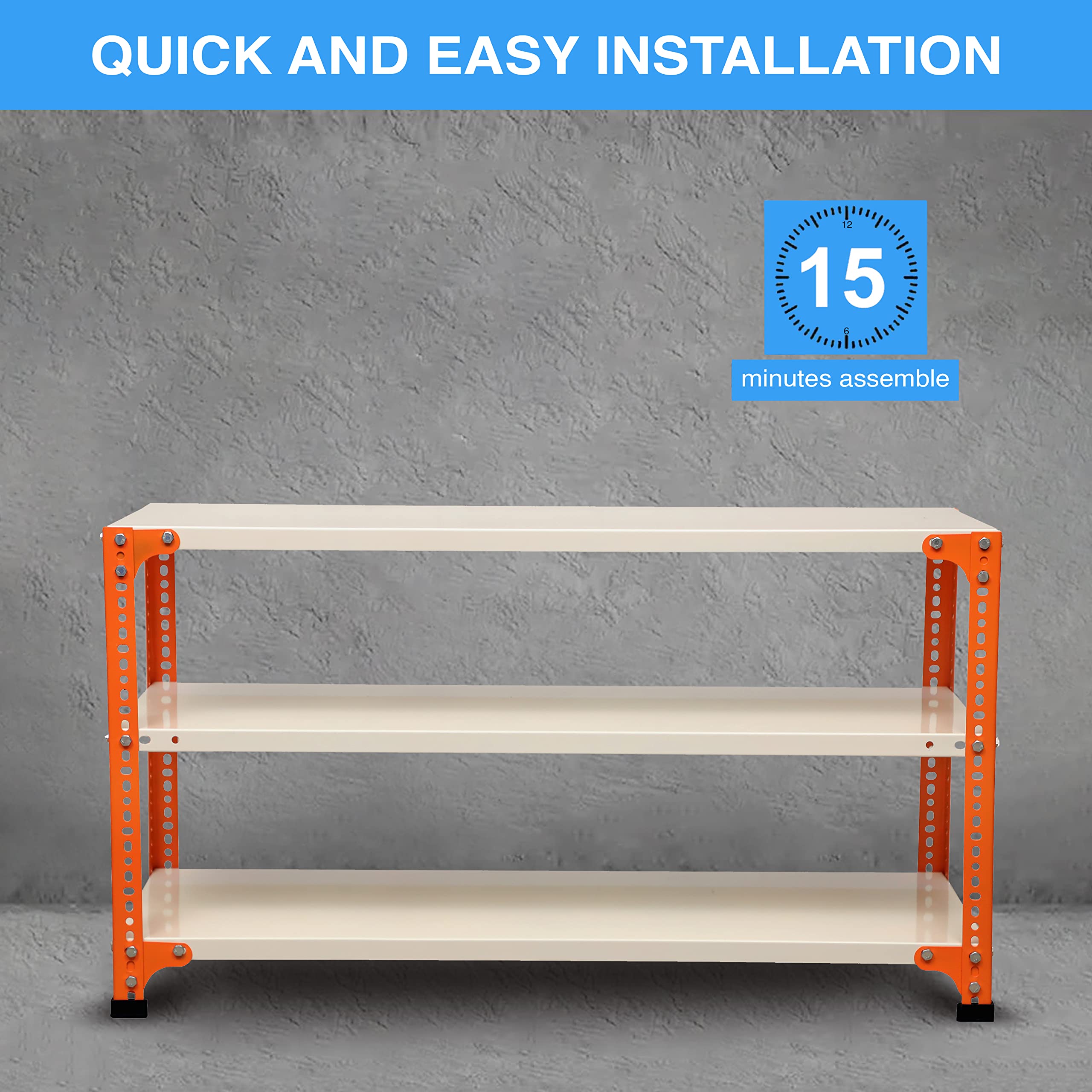 Item NameMil-Nil Prime CRC Sheet 3 Shelf 22 Gauge Multipurpose Slotted Angle Rack | Adjustable Shelf Hight Powder Coated Rack for Home & Kitchen (24x47x12 Inch Orange/Ivory) 16 Gauge Angles