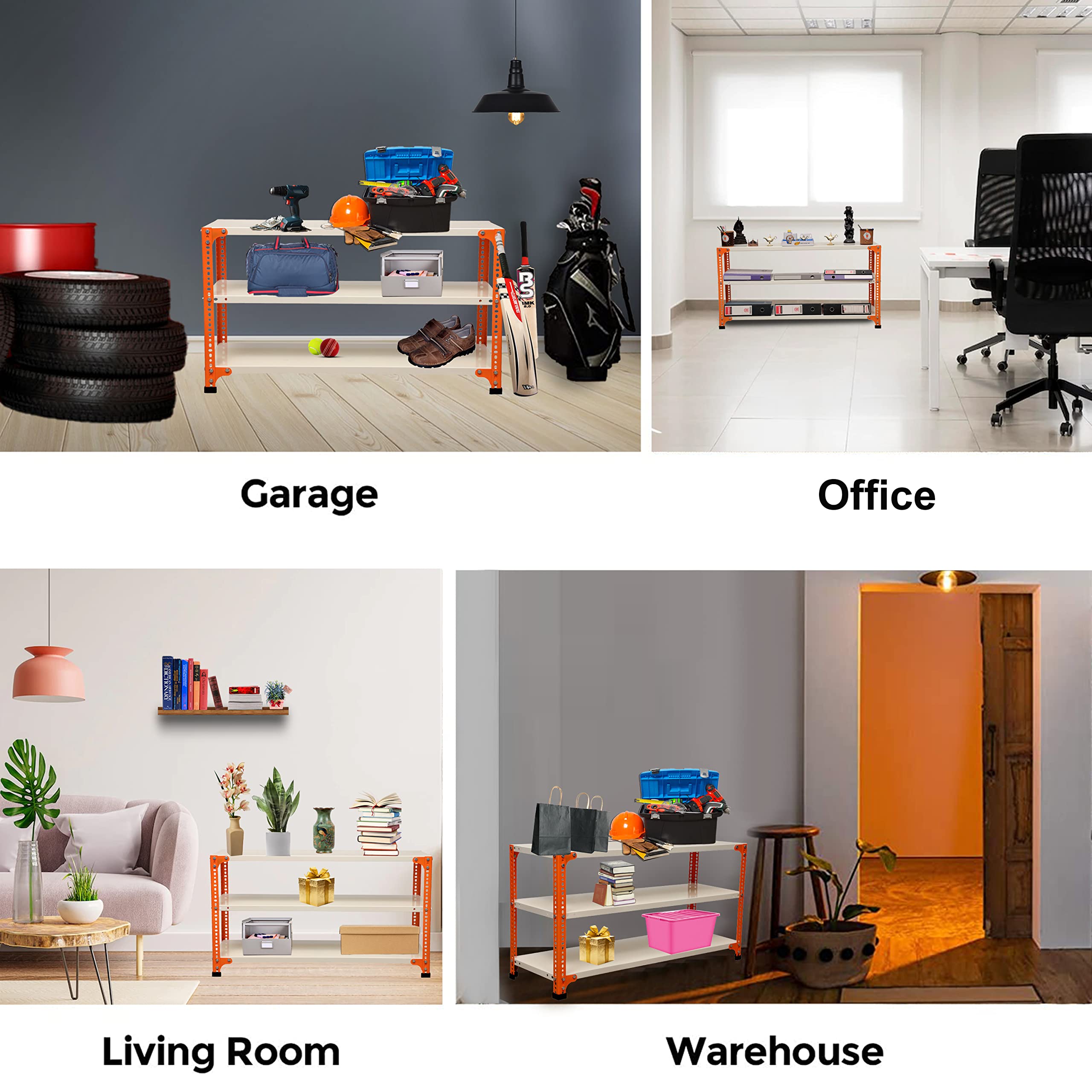 Bullet Point 4✔ MATERIAL: PRIME CRC SHEET, Iron Slotted Angle, Free Protective Rubber Feet. Usage: It's a Multipurpose Storage rack that can be used as a kitchen rack, book rack, cloth rack, office rack, living room rack, Industries rack, etc.
