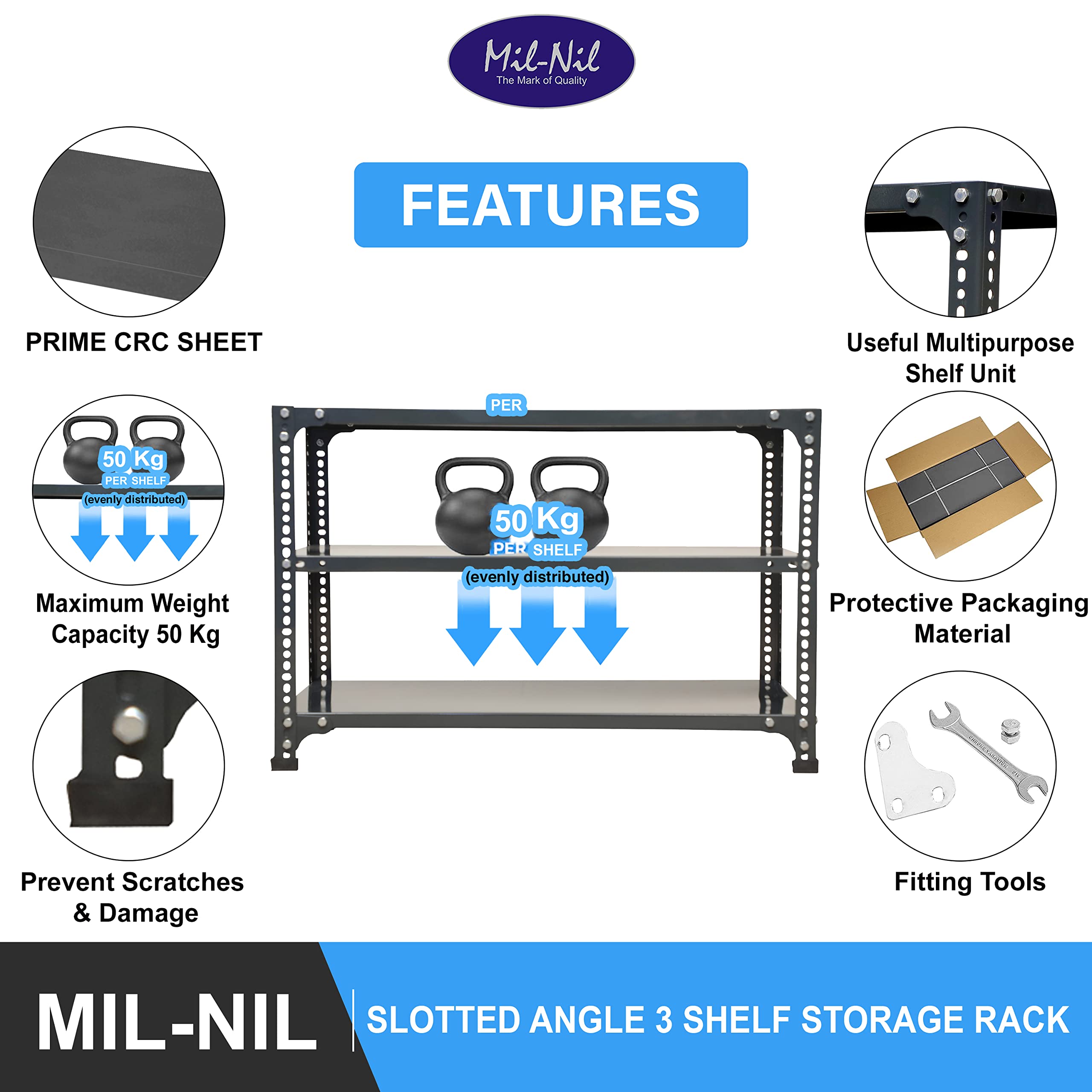 Item NameMil-Nil Prime CRC Sheet 3 Shelf 22 Gauge Multipurpose Slotted Angle Rack | Adjustable Shelf Hight Rack for Home & Kitchen (24x36x18 Inch, 11.4 Kg, Grey) 16 Gauge Angles