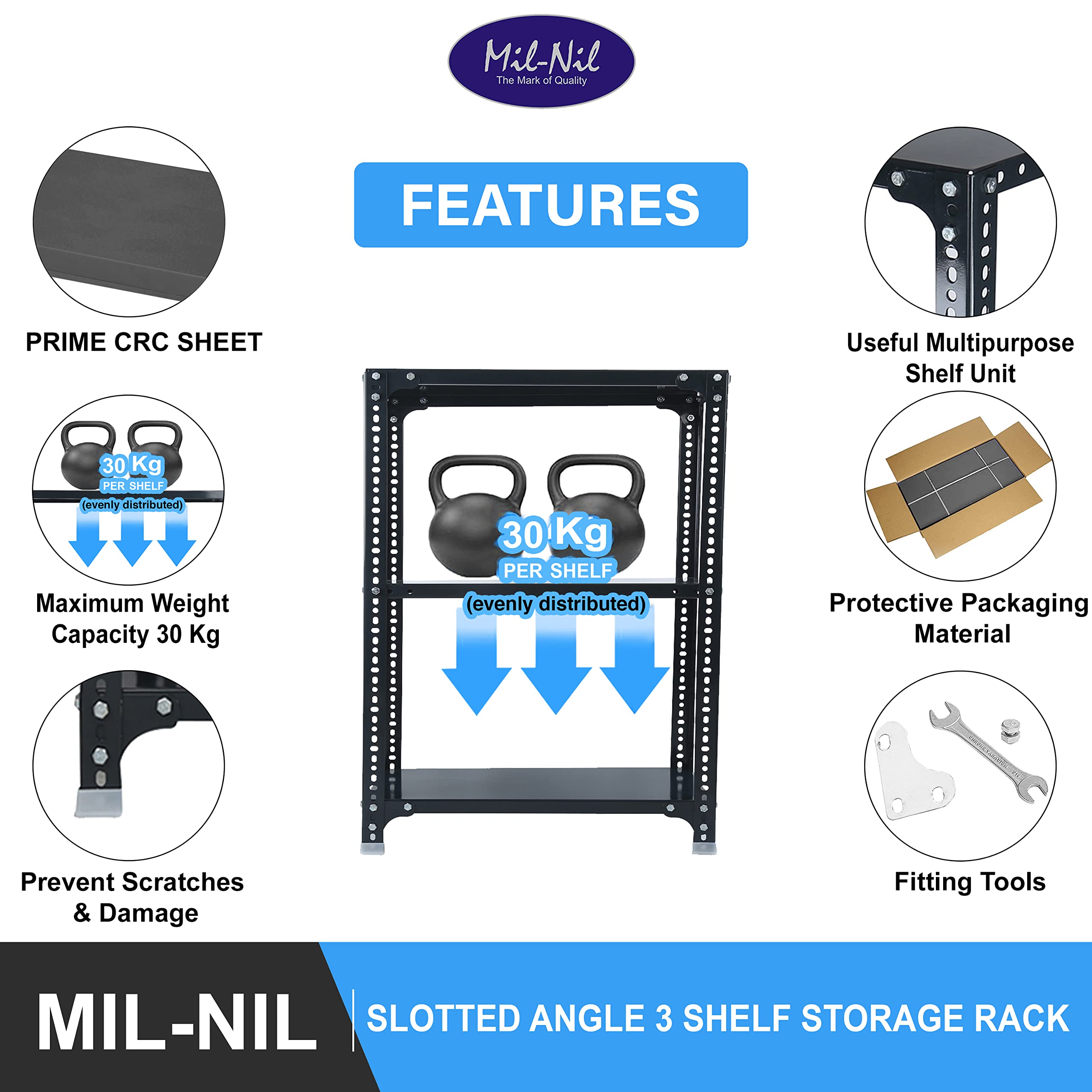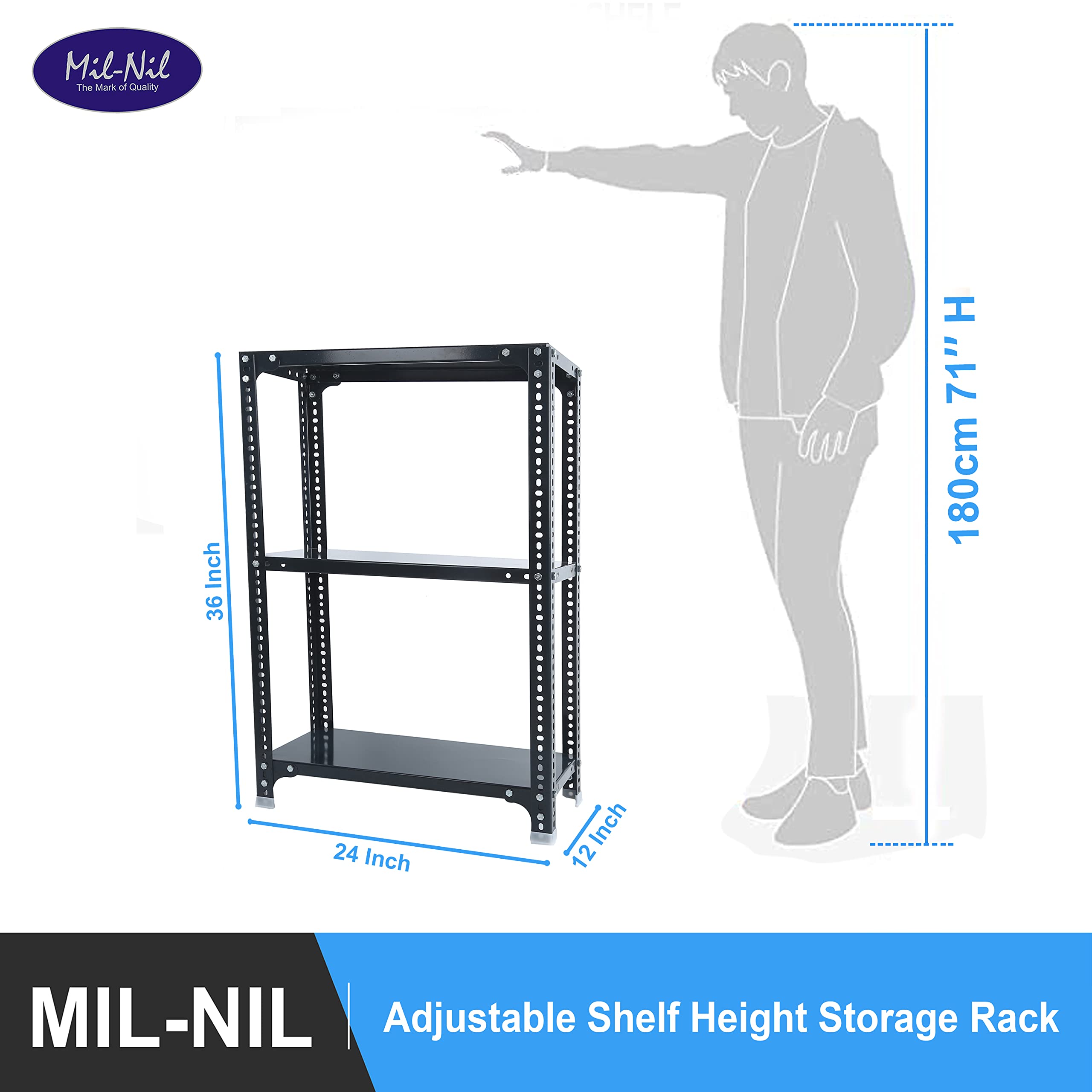 Item NameMil-Nil Prime CRC Sheet 3 Shelf 24 Gauge Multipurpose Slotted Angle Rack | Adjustable Shelf Hight for Home & Kitchen 18 Gauge Angle (36X24X12 inches, 7.1 Kg, Grey)