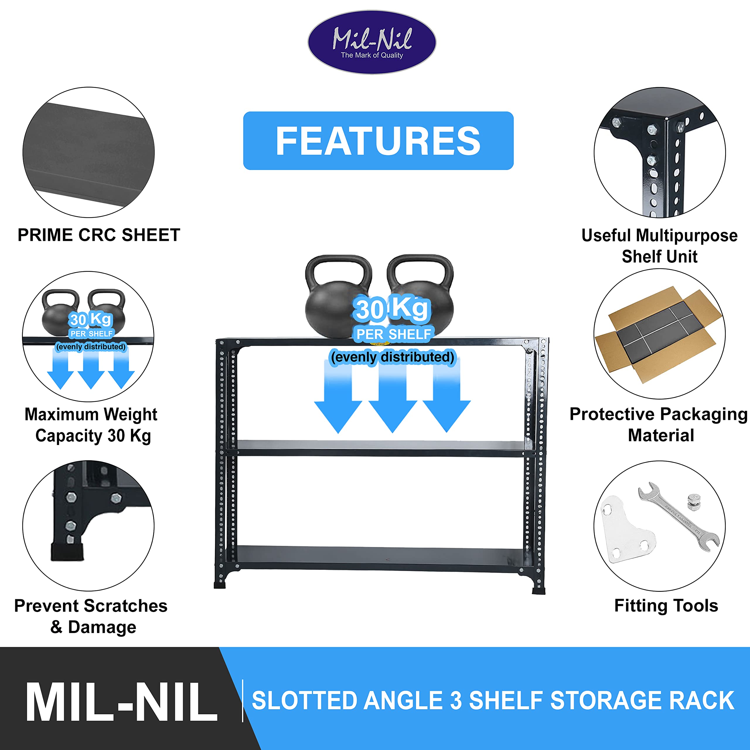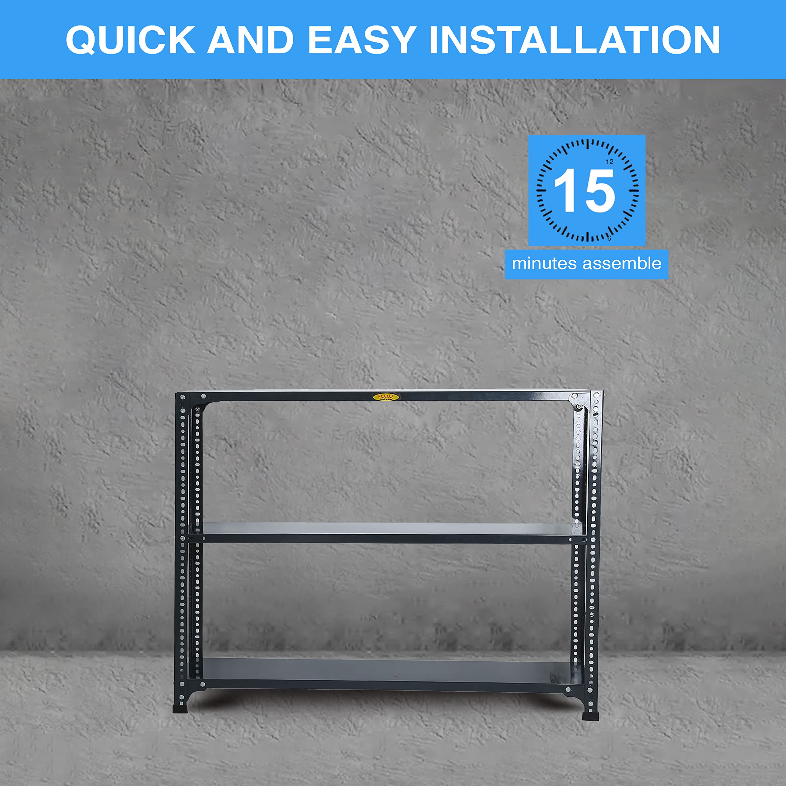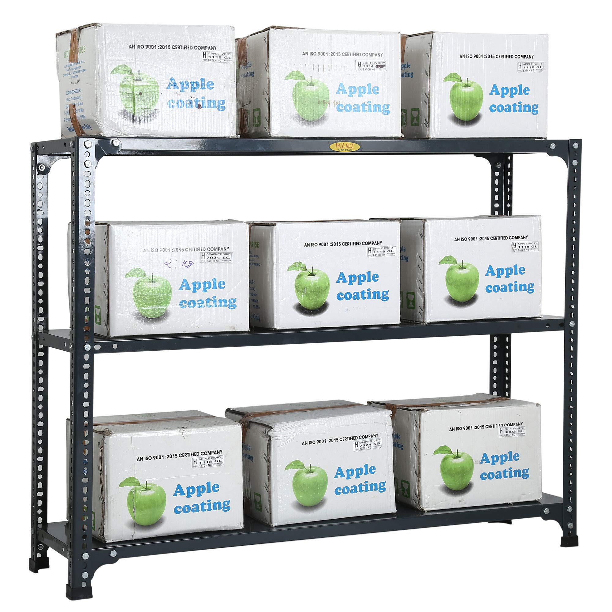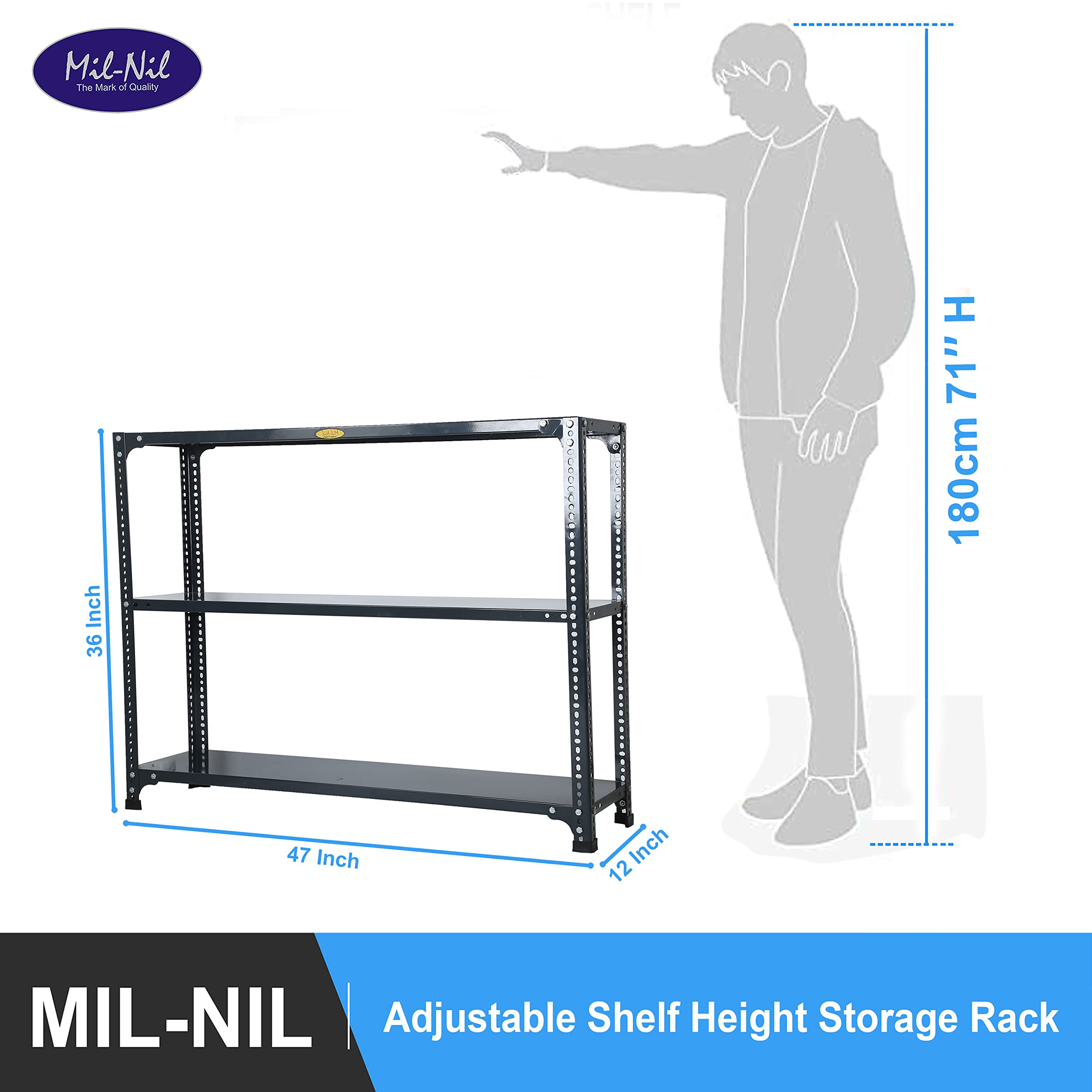 Item NameMil-Nil Prime CRC Sheet 3 Shelf 24 Gauge Multipurpose Slotted Angle Rack | Adjustable Shelf Hight for Home & Kitchen 18 Gauge Angle (36X47X12 inches, 10.425 Kg, Grey)