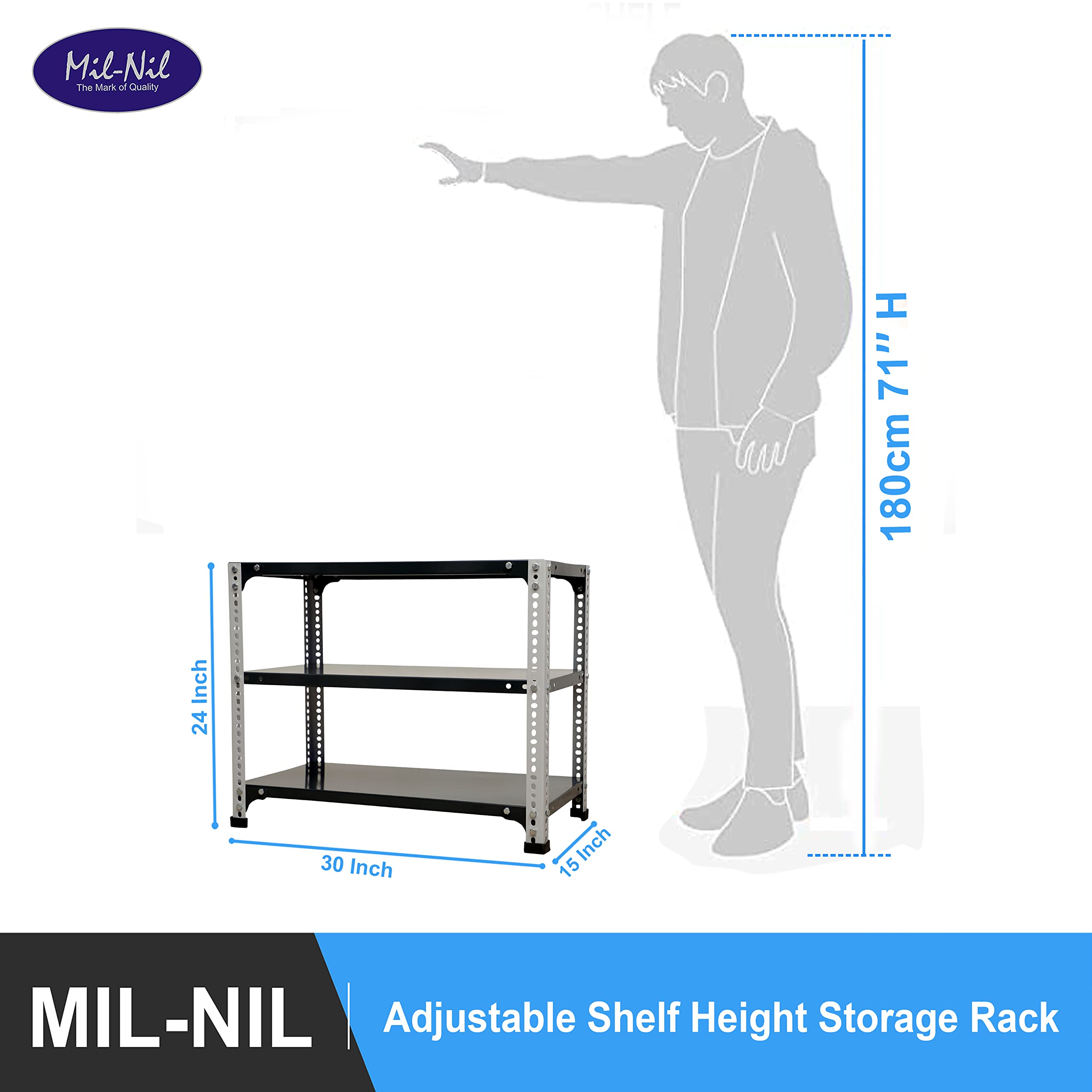 Mil-Nil Prime CRC Sheet 3 Shelf 24 Gauge Multipurpose Slotted Angle Rack | Adjustable Shelf Hight Rack for Home & Kitchen (24x30x15 Inch, 8.1 Kg, Grey/Havels)