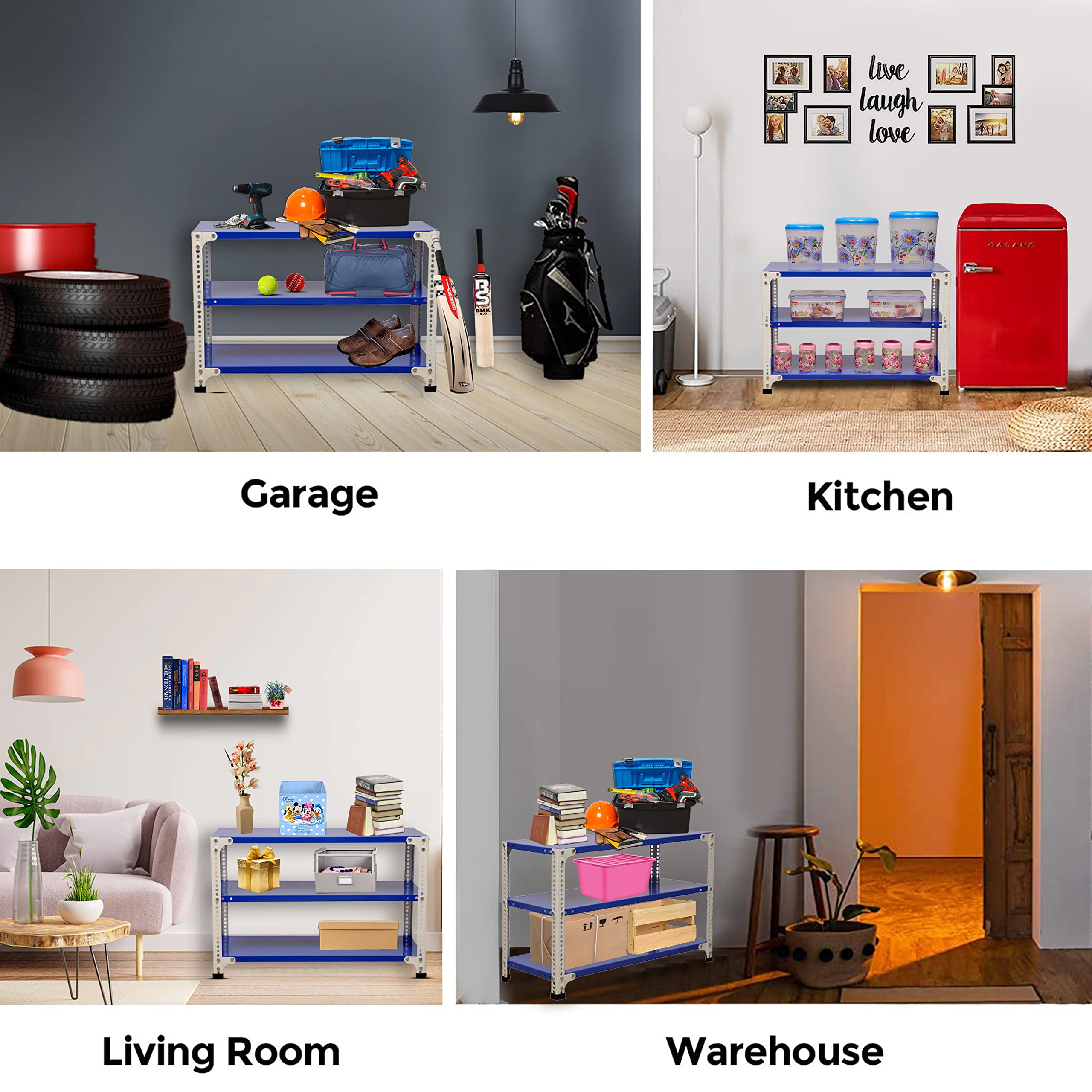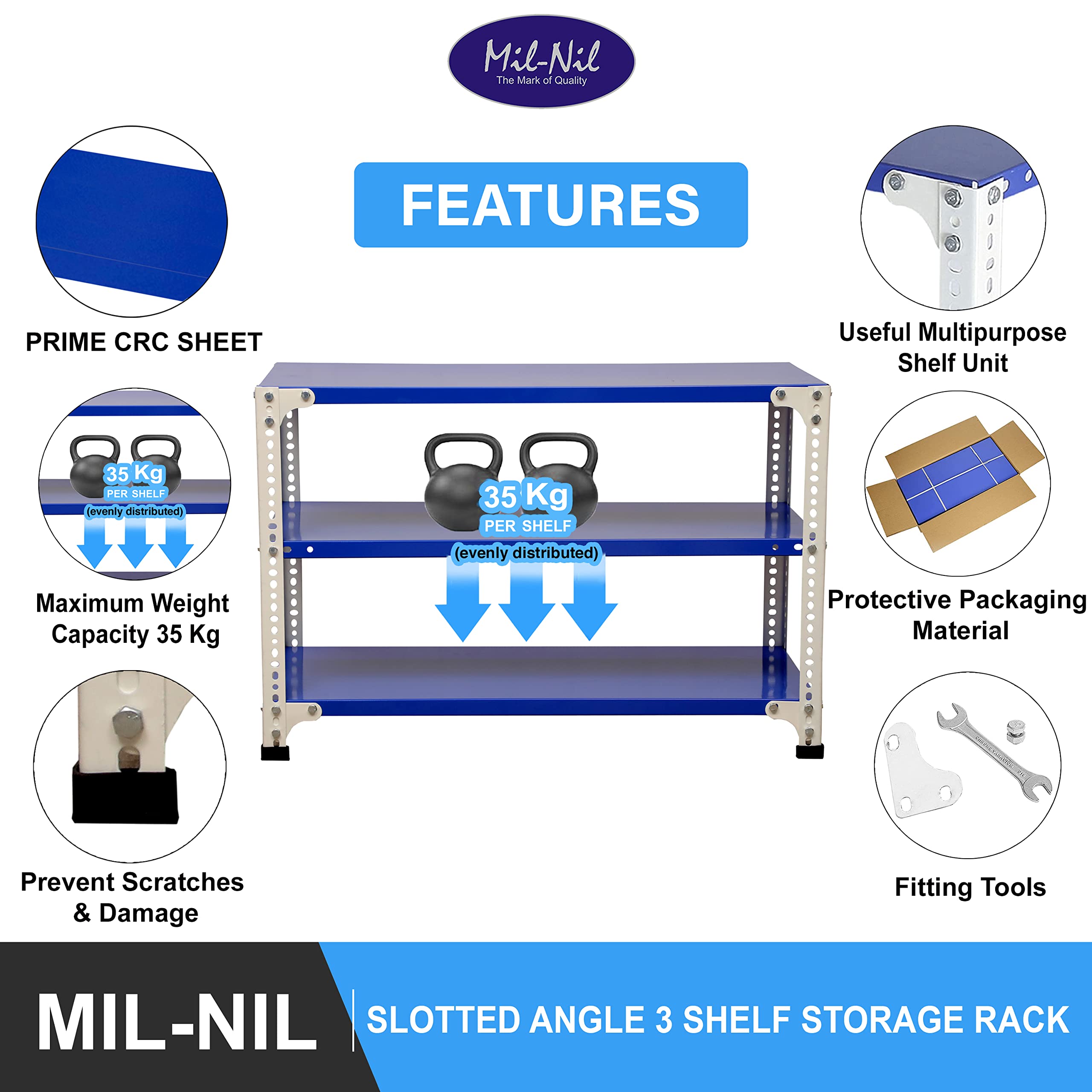 Item NameMil-Nil PRIME CRC SHEET 3 Shelf 24 Gauge Multipurpose Slotted Angle Rack | Adjustable Shelf Hight Rack for Home & Kitchen (24x36x18 Inch, 10.2 Kg, Blue/Whie) 16 Gauge Angles