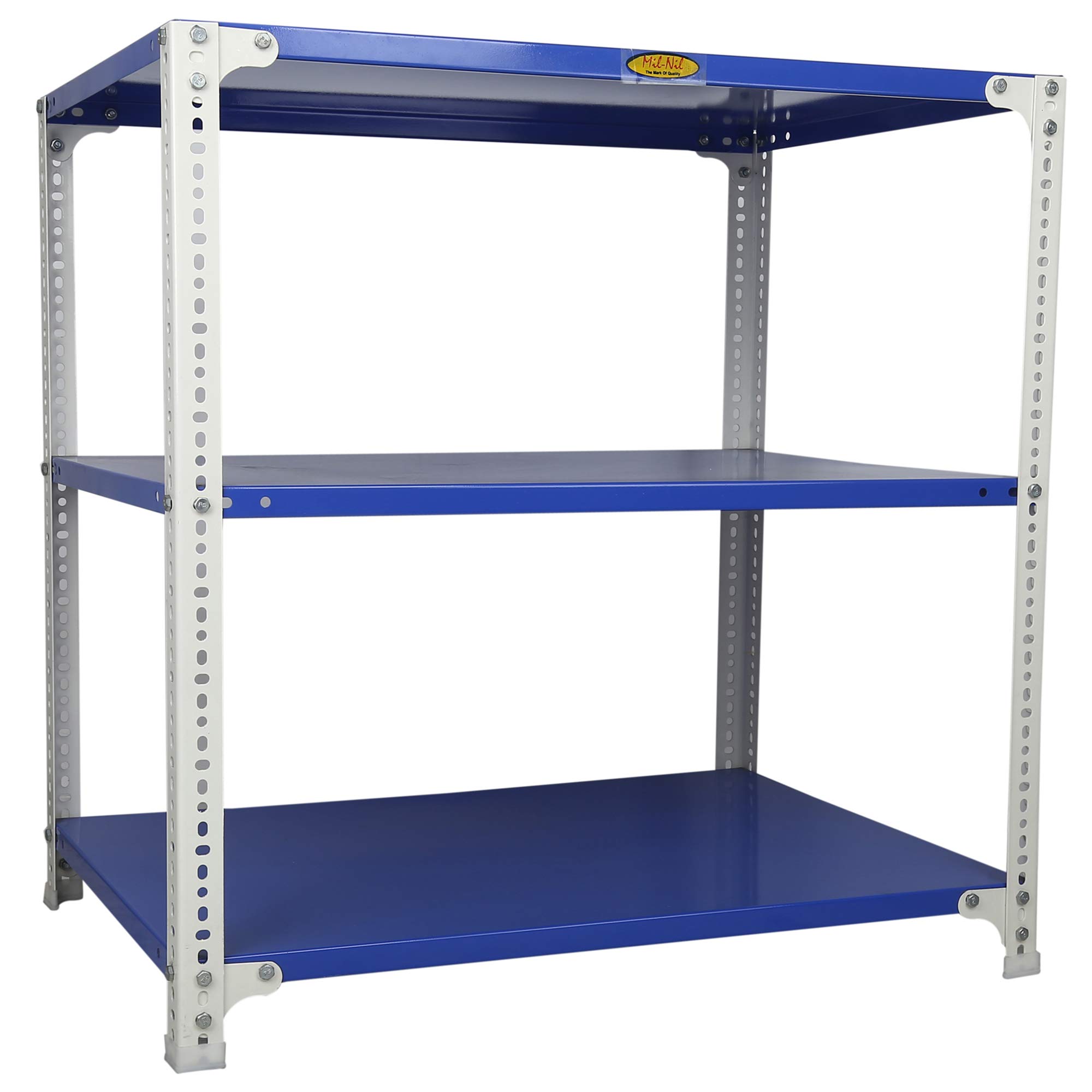Item NameMil-Nil Prime CRC Sheet 3 Shelf Multipurpose Slotted Angle Rack, 36 x 36 x 24 Inch, 18 Gauge [(Blue-White) Powder Coating] 14 Gauge Angles