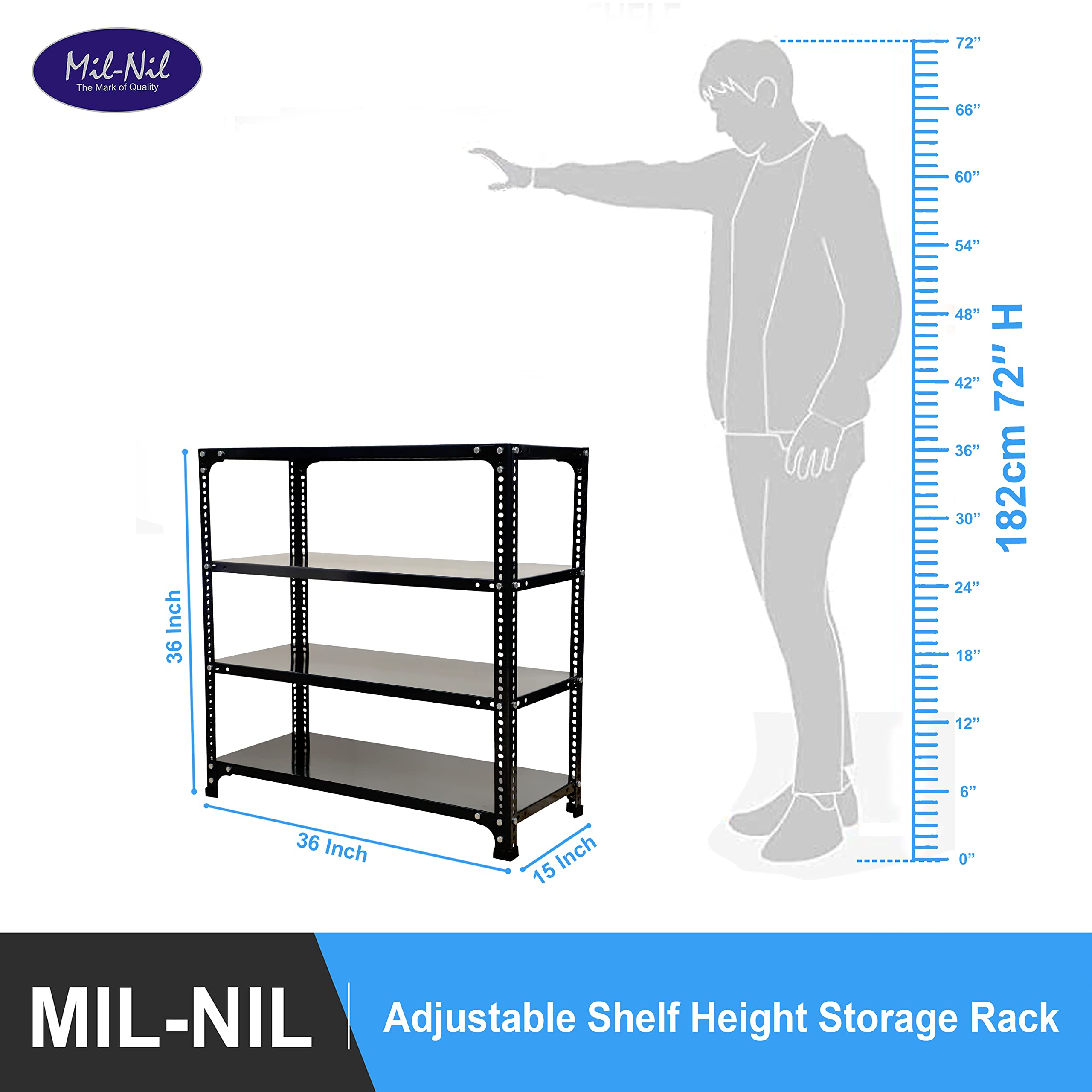 Item NameMil-Nil Prime CRC Sheet 4 Shelf 22 Gauge Multipurpose Slotted Angle Rack | Adjustable Shelf Hight Rack for Home & Kitchen (36x36x15 Inch, 14.4 Kg, Grey) 16 Gauge Angles
