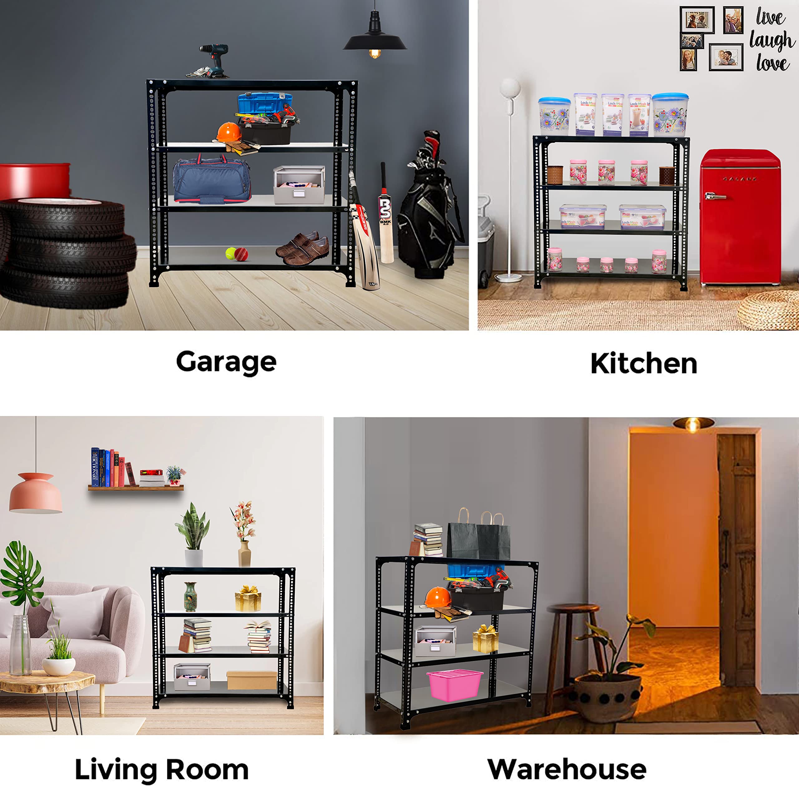 Bullet Point 4✔ MATERIAL: PRIME CRC SHEET, Iron Slotted Angle, Free Protective Rubber Feet. Usage: It's a Multipurpose Storage rack that can be used as a kitchen rack, book rack, cloth rack, office rack, living room rack, Industries rack, etc.
