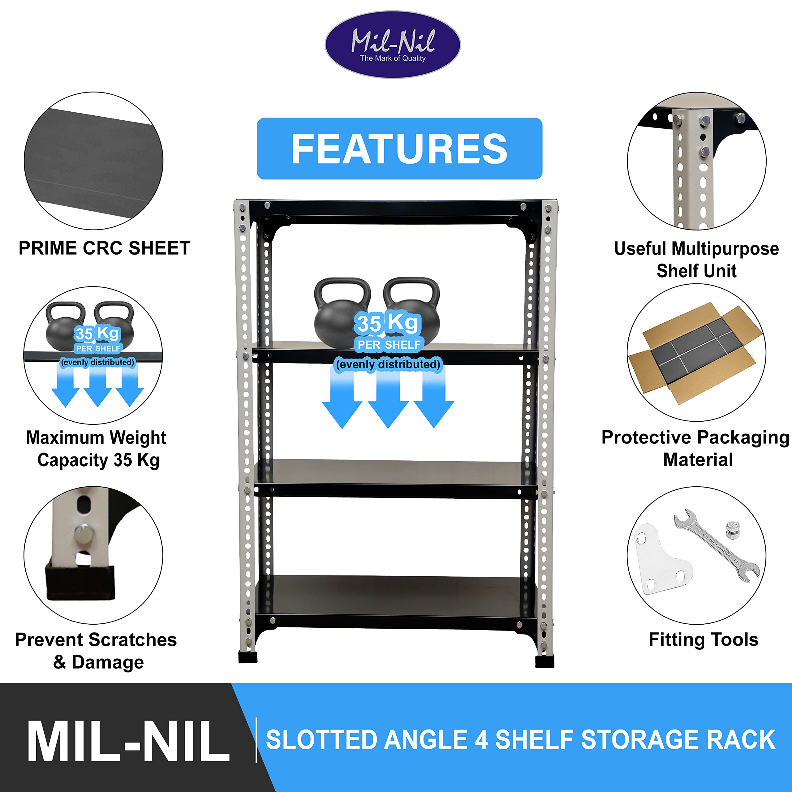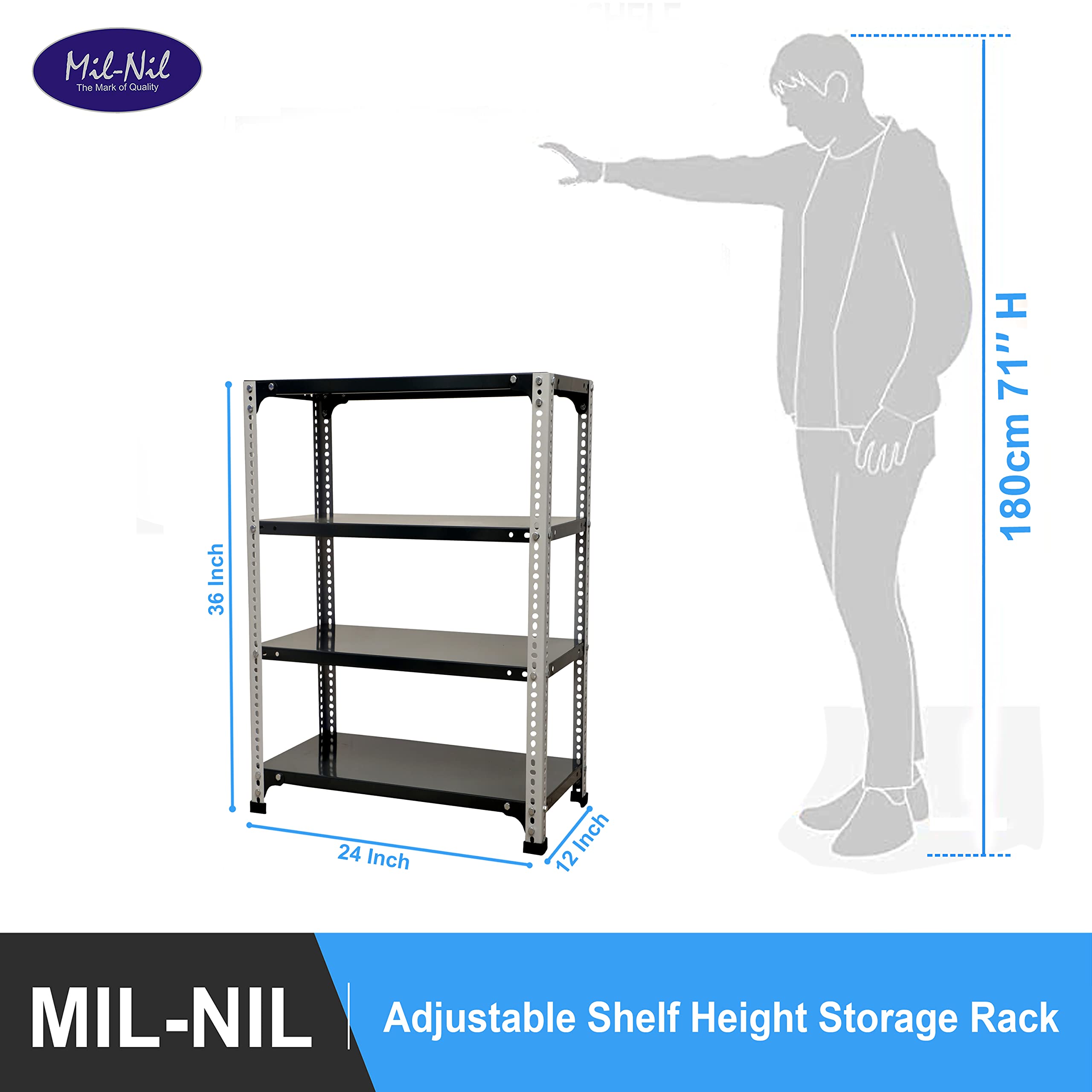 Item NameMil-Nil Prime CRC Sheet 4 Shelf 24 Gauge Multipurpose Slotted Angle Rack | Adjustable Shelf Hight Rack for Home & Kitchen (36x24x12 Inch, 9.4 Kg, Grey/Havels) 16 Gauge Agles