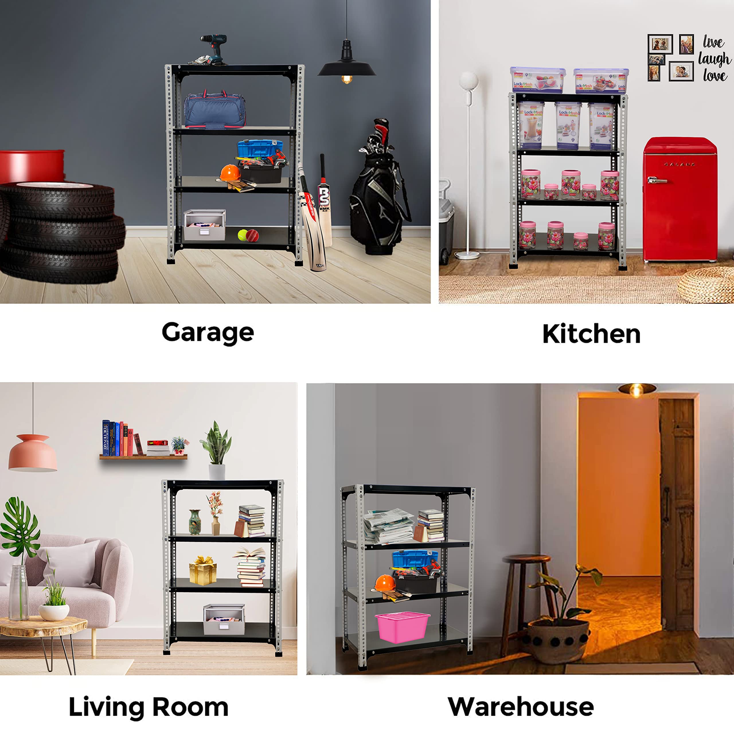 Bullet Point 4✔ MATERIAL: PRIME CRC SHEET, Iron Slotted Angle, Free Protective Rubber Feet. Usage: It's a Multipurpose Storage rack that can be used as a kitchen rack, book rack, cloth rack, office rack, living room rack, Industries rack, etc.