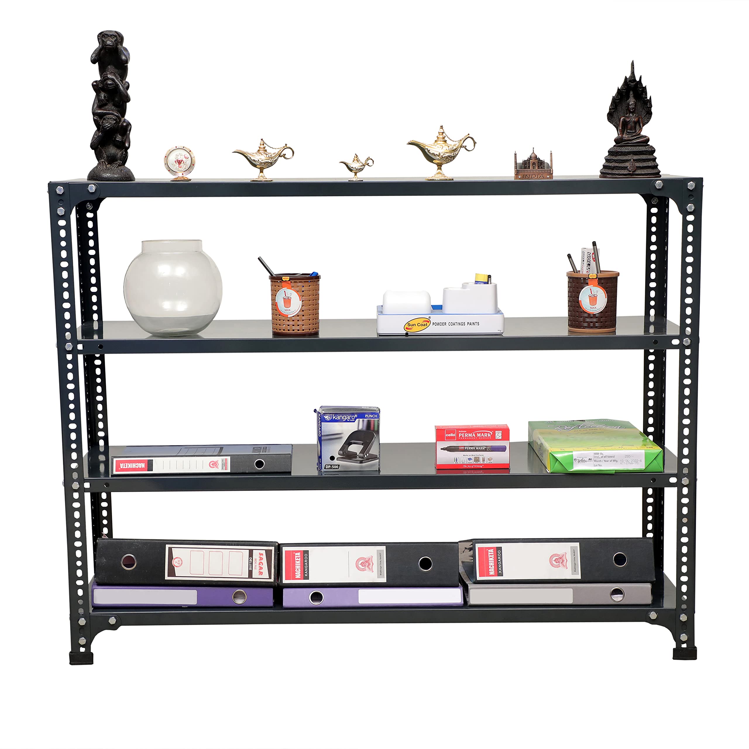 Bullet Point 4✔ MATERIAL: PRIME CRC SHEET, Iron Slotted Angle, Free Protective Rubber Feet. Usage: It's a Multipurpose Storage rack that can be used as a kitchen rack, book rack, cloth rack, office rack, living room rack, Industries rack, etc.