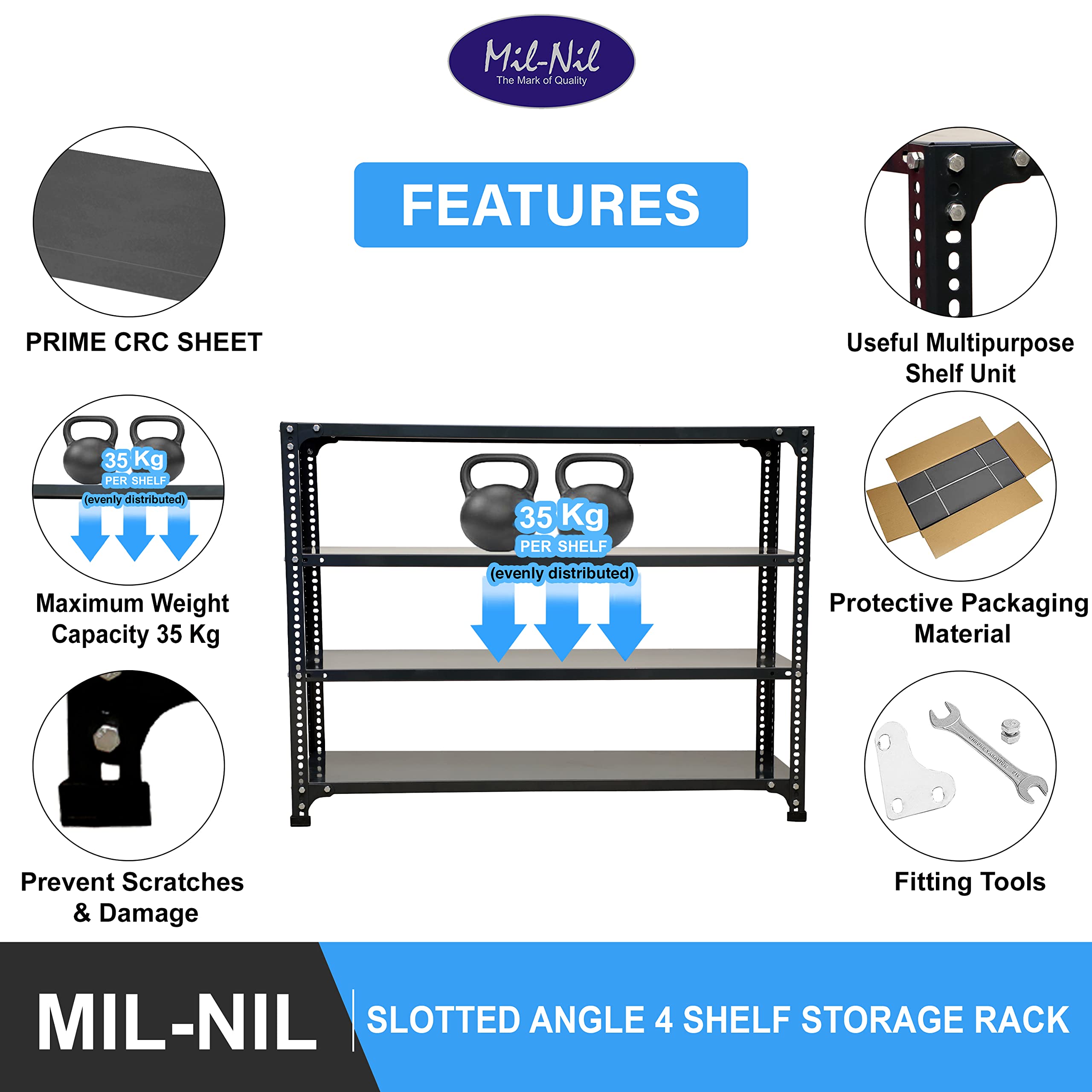 Item NameMil-Nil Prime CRC Sheet 4 Shelf 24 Gauge Multipurpose Slotted Angle Rack | Adjustable Shelf Hight Rack for Home & Kitchen (36x47x12 Inch, 13.6 Kg, Grey) 16 Gauge Angles