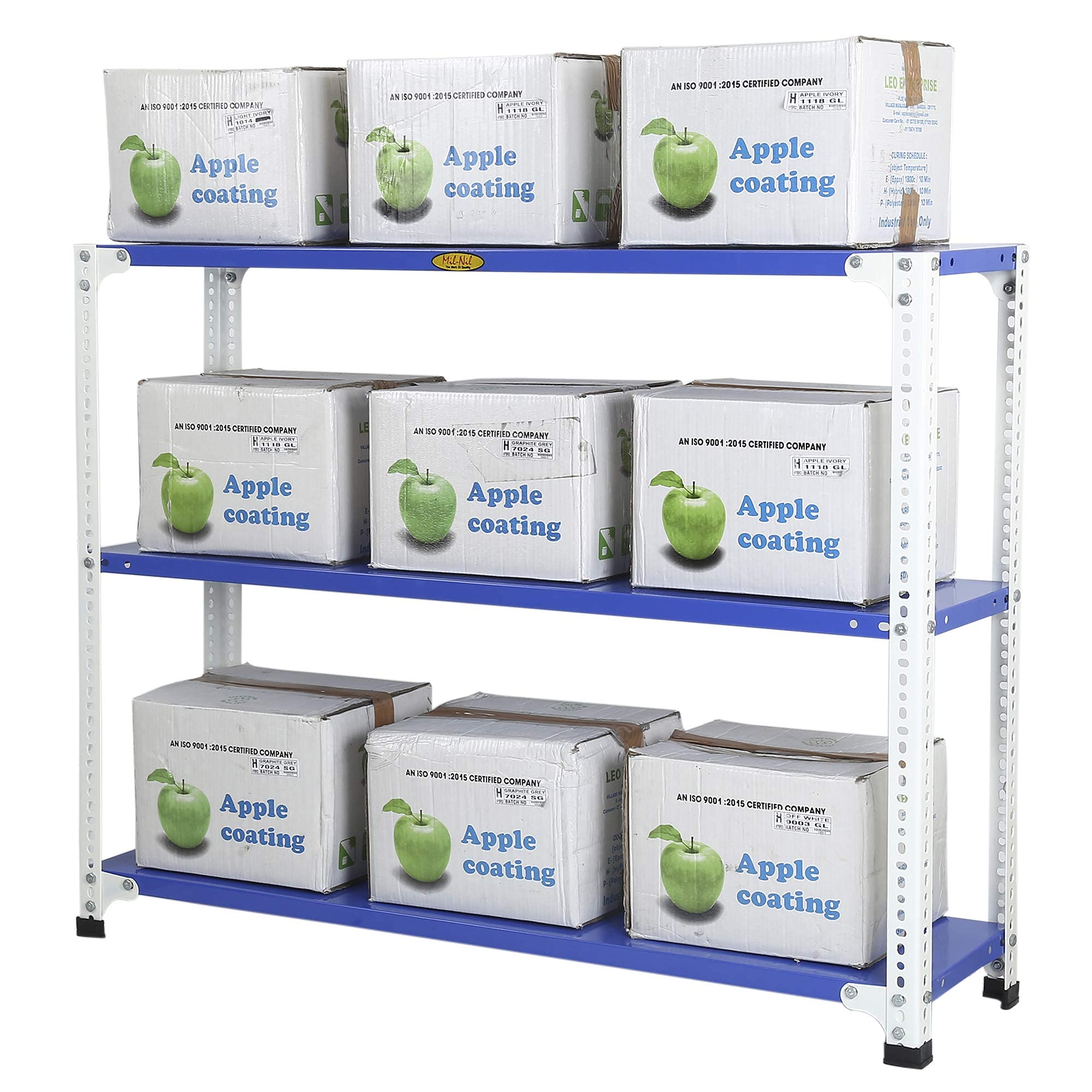 Item NameMil-Nil Prime CRC Sheet 4 Shelf Multipurpose Slotted Angle Rack, 48 x 47 x 12 Inch, 20 Gauge (Blue-White) Powder Coated 14 Gauge Angles