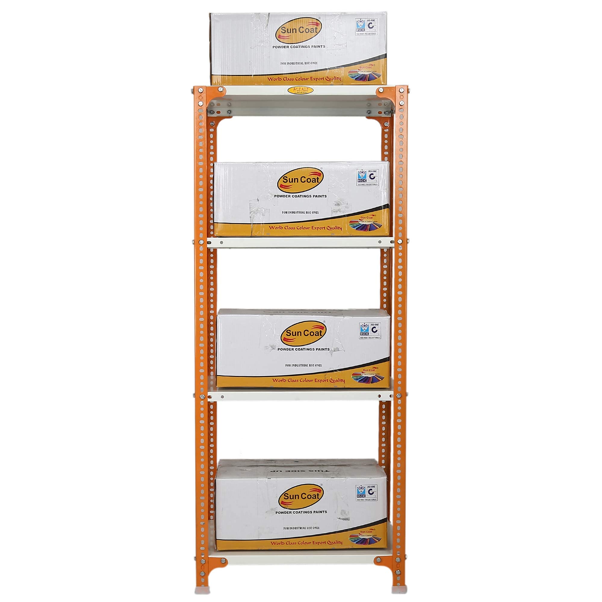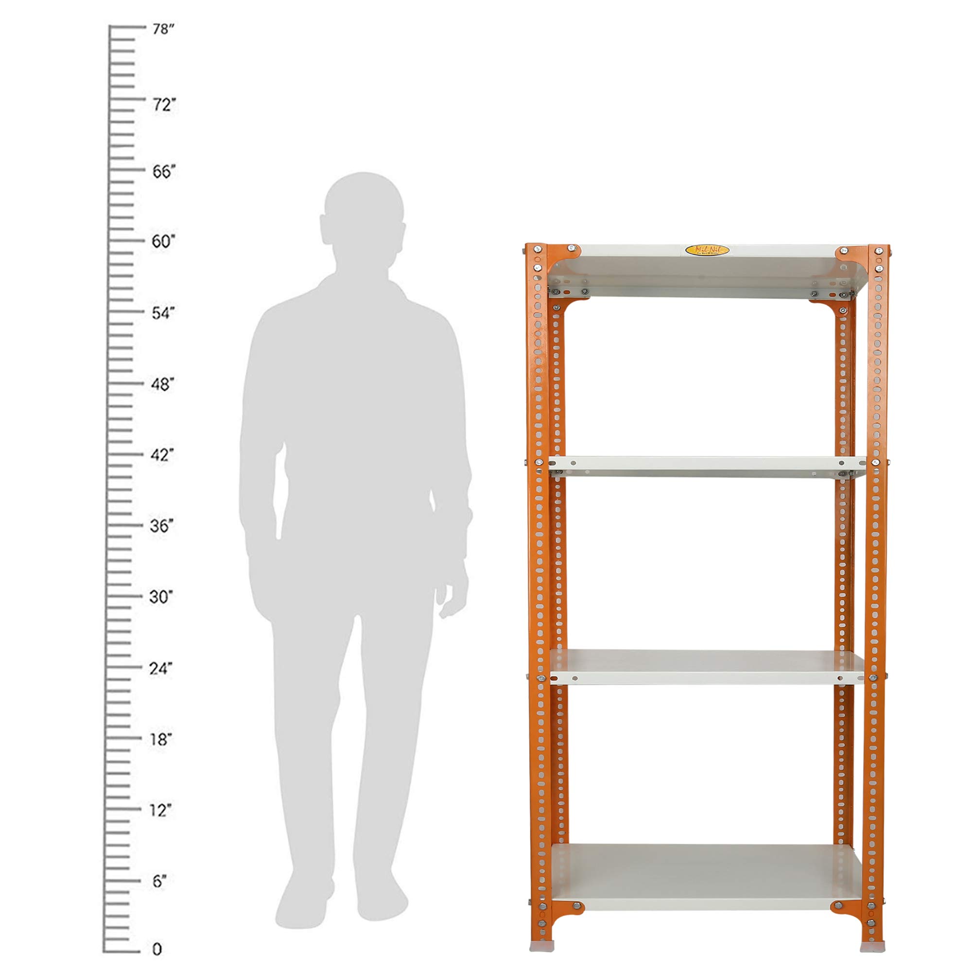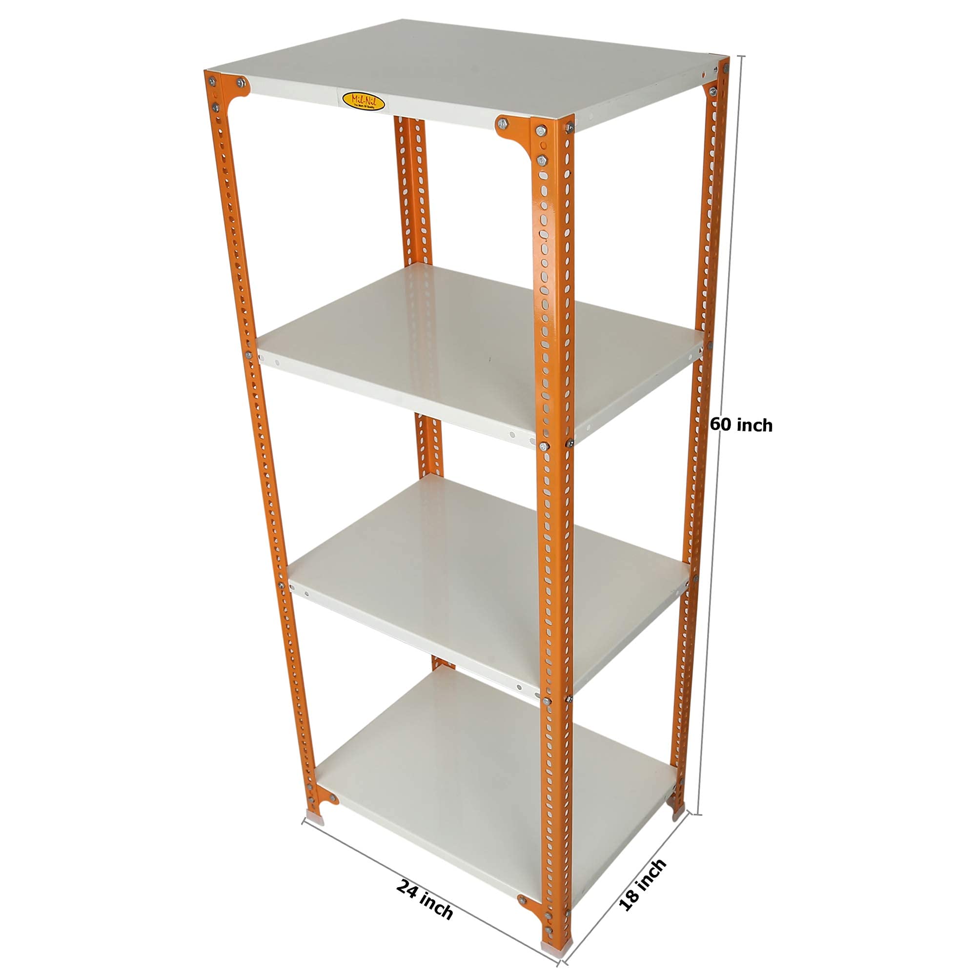Item NameMil-Nil Prime CRC Sheet 4 Shelf Multipurpose Slotted Angle Rack, 60 x 24 x 18 Inch [(Orange-Ivory) Powder Coating] 16 Gauge Angles
