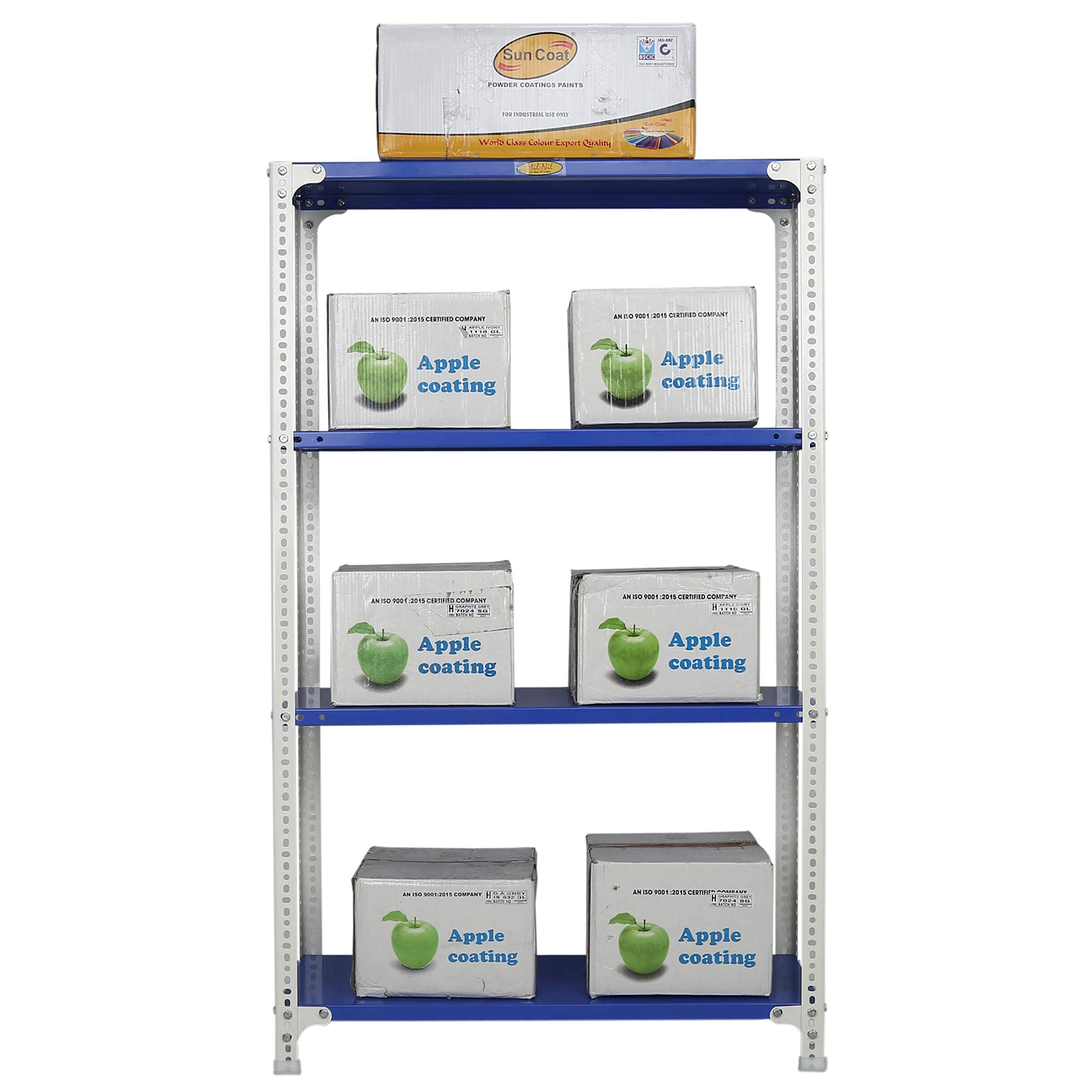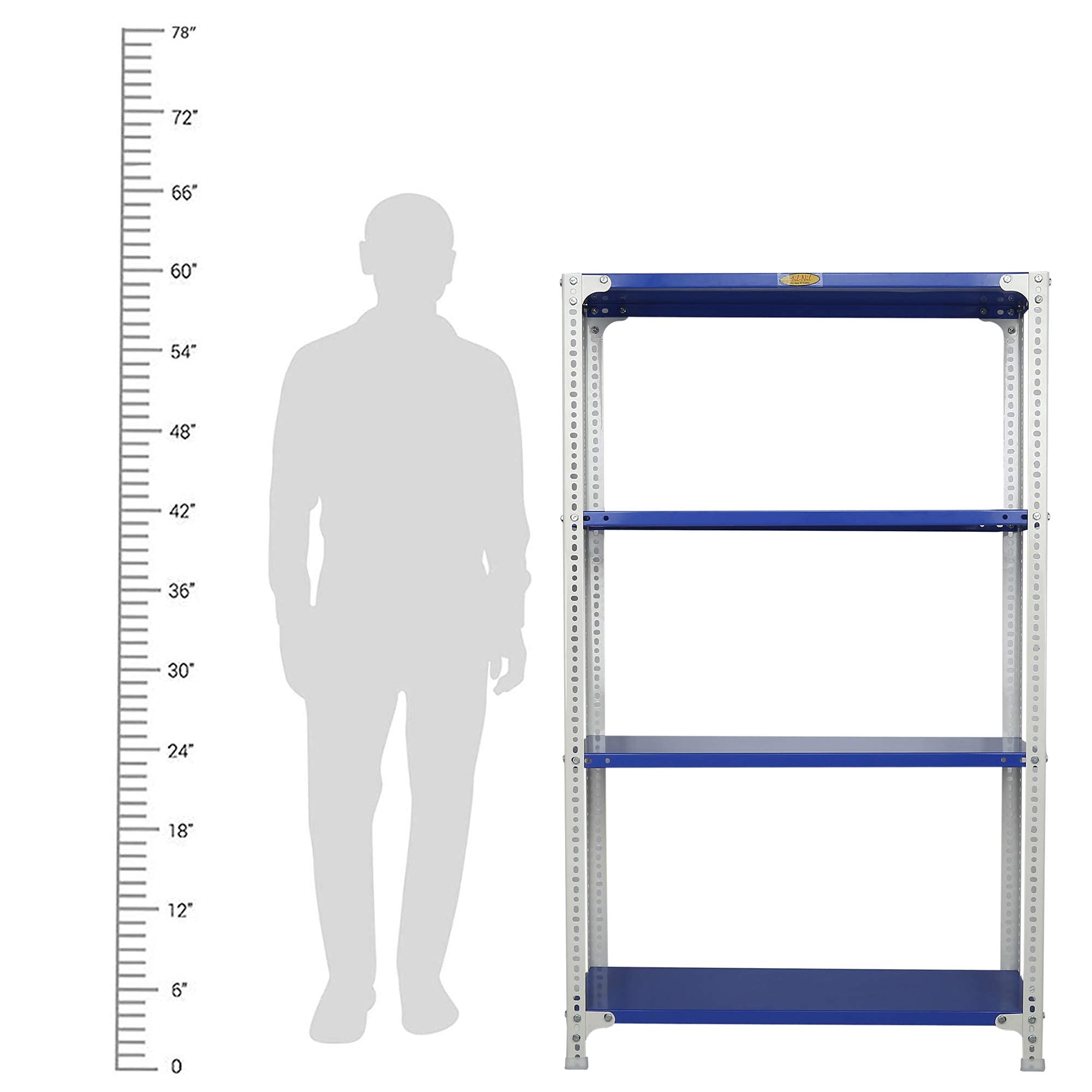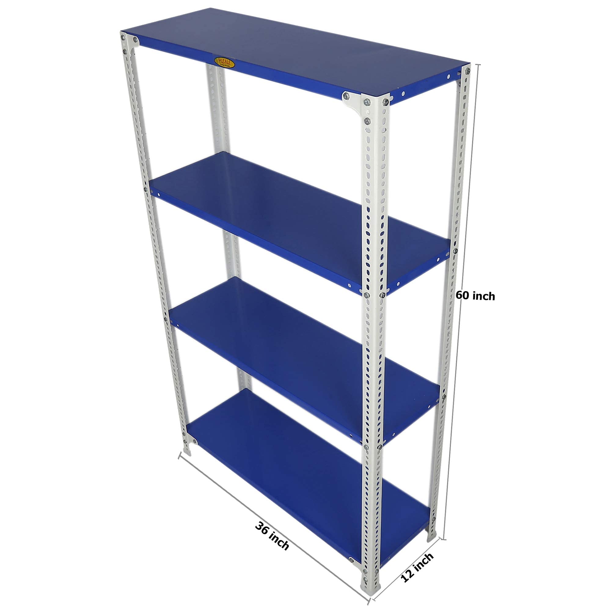 Item NameMil-Nil Prime CRC Sheet 4 Shelf Multipurpose Slotted Angle Rack, 60 x 36 x 12 Inch, 20 Gauge [(Blue-White) Powder Coating] 14 Gauge Angles