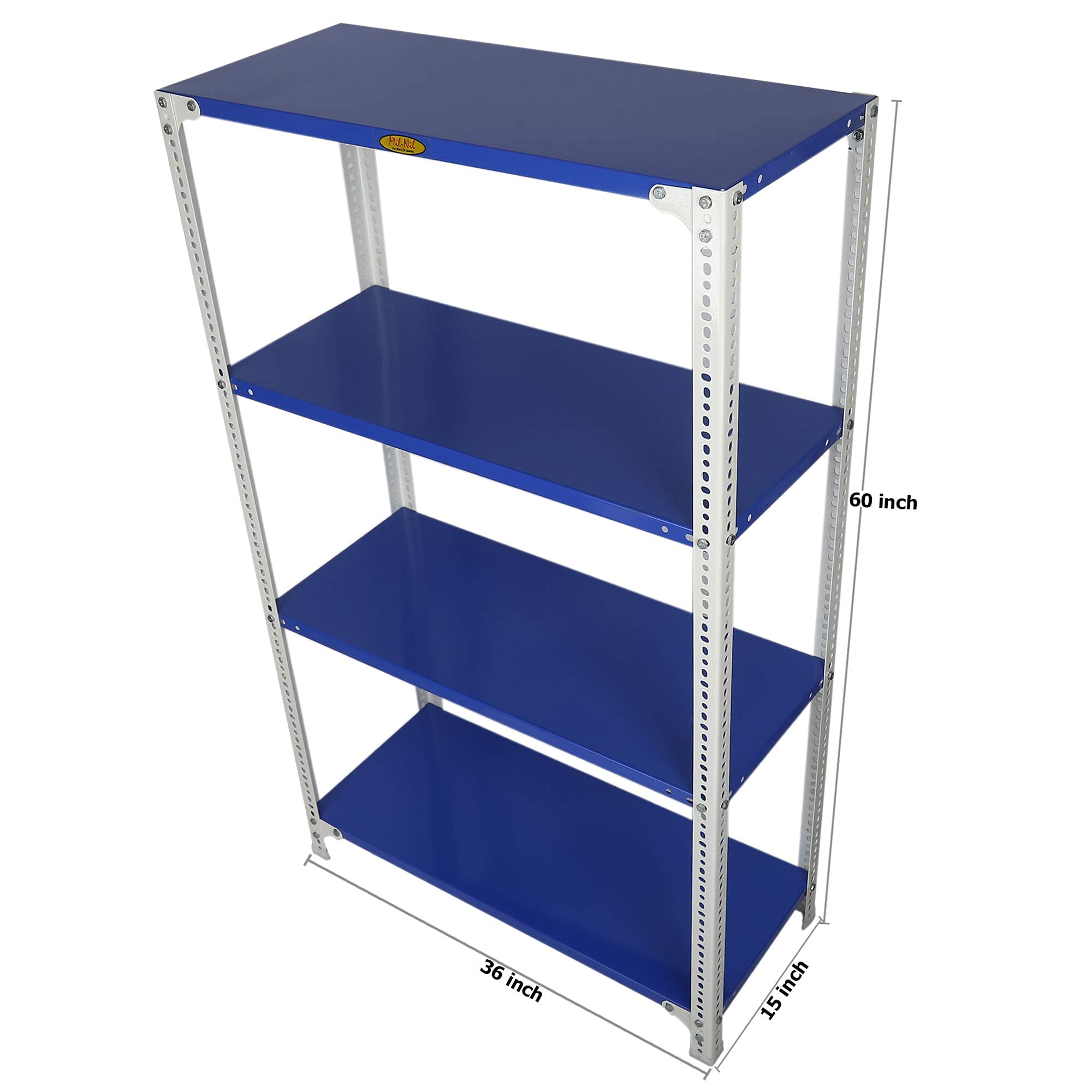 Item NameMil-Nil Prime CRC Sheet 4 Shelf Multipurpose Slotted Angle Rack, 60 x 36 x 15 Inch, 18 Gauge [(Blue-White) Powder Coating] 14 Gauge Angles