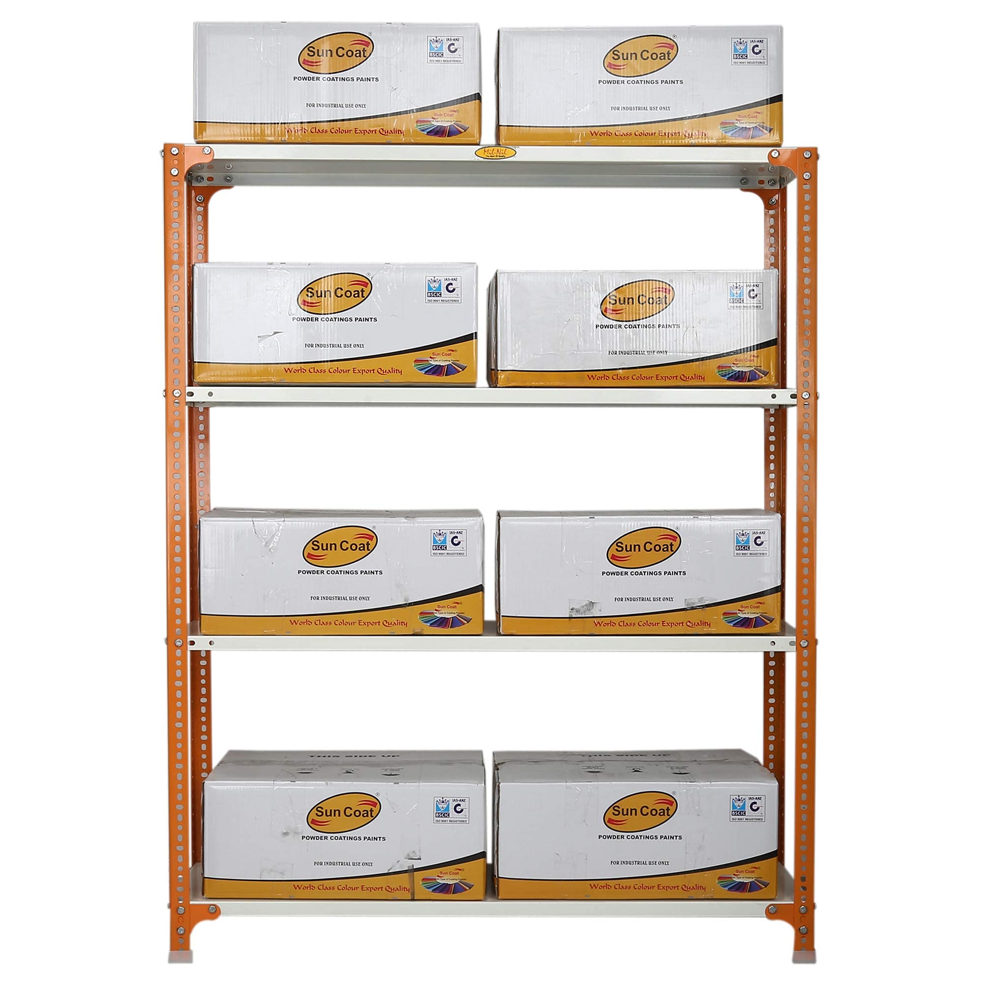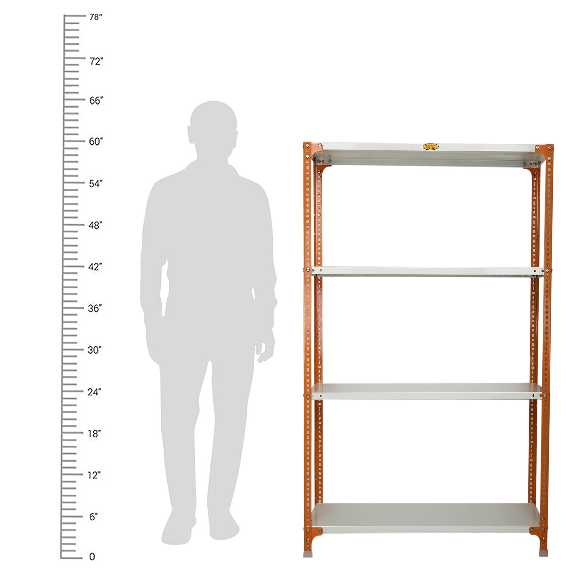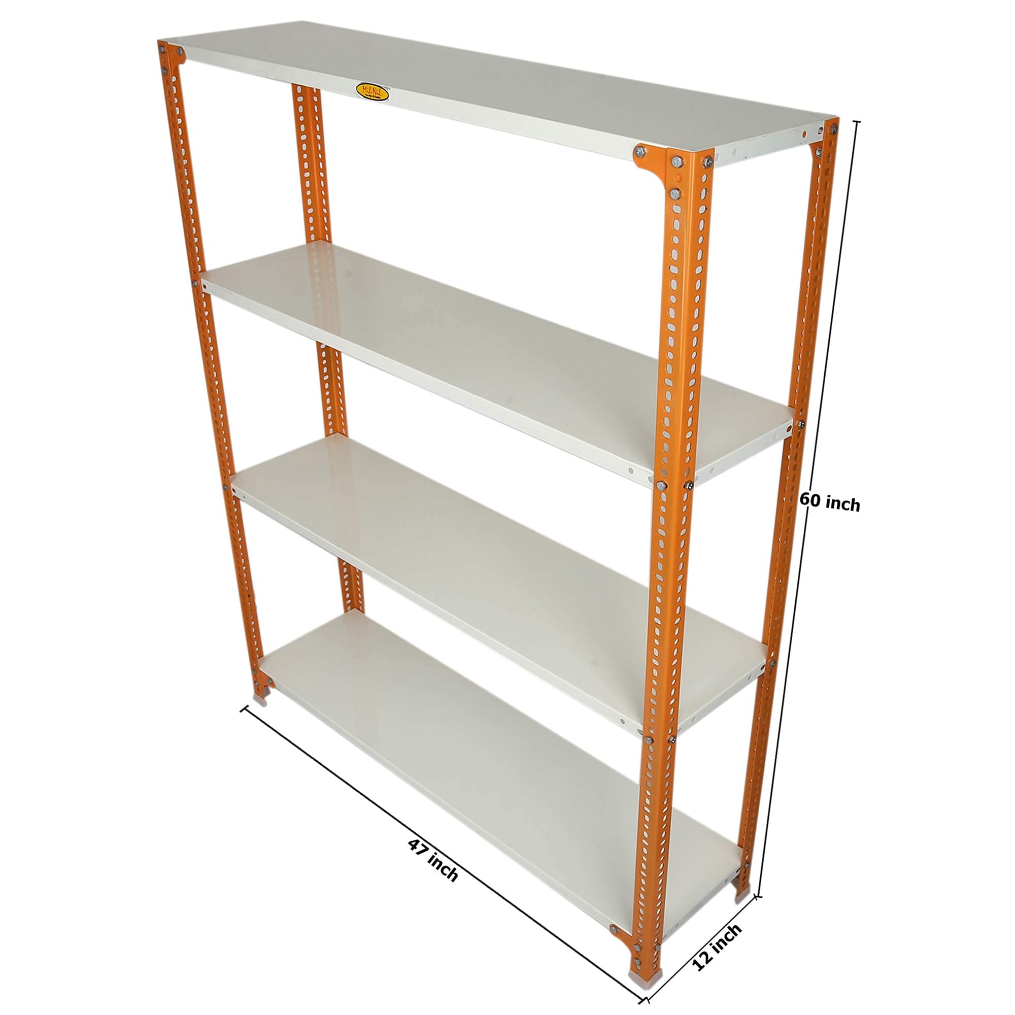 Item NameMil-Nil Prime CRC Sheet 4 Shelf Multipurpose Slotted Angle Rack, 60 x 47 x 12 Inch, 20 Gauge [(Orange-Ivory) Powder Coating] 14 Gauge Angles