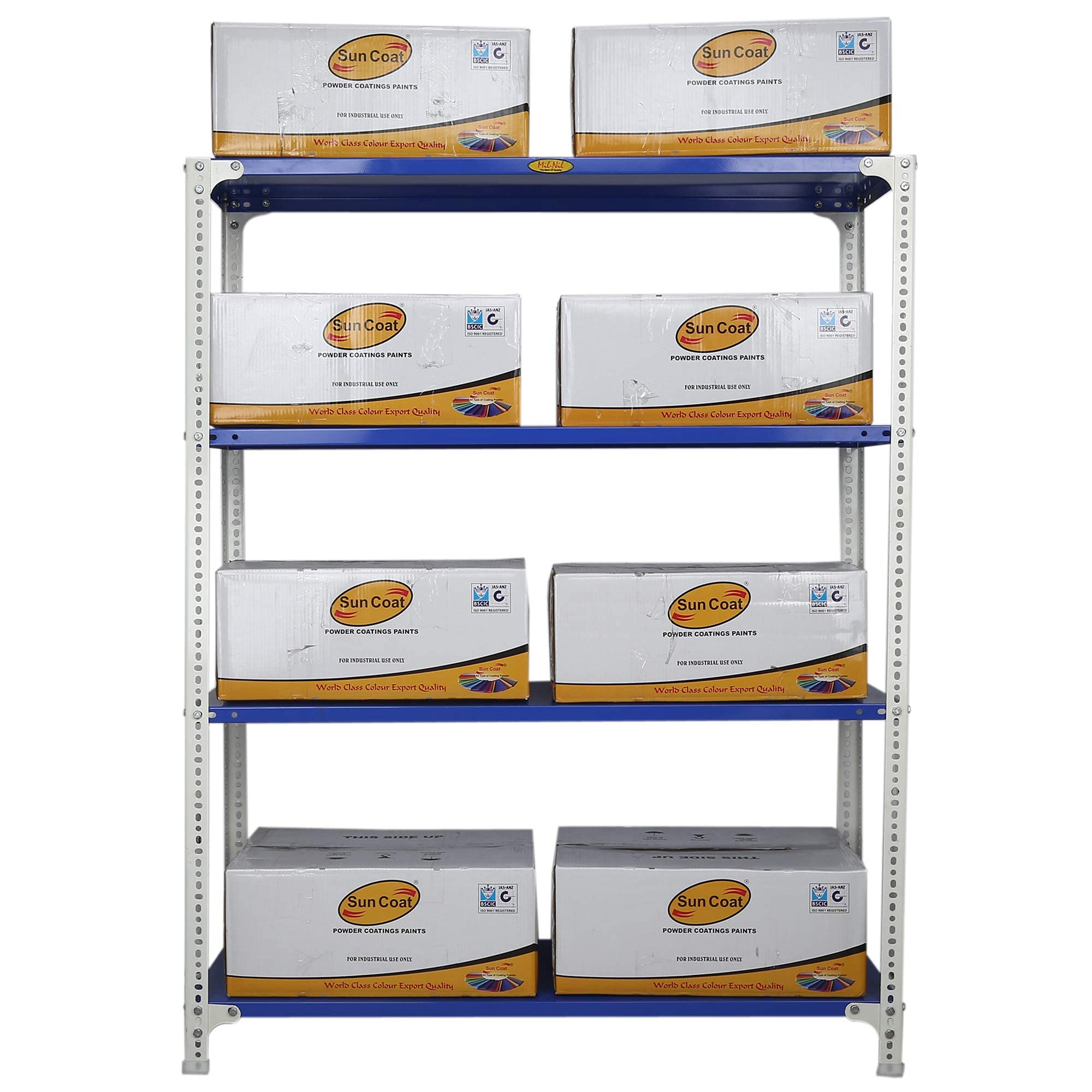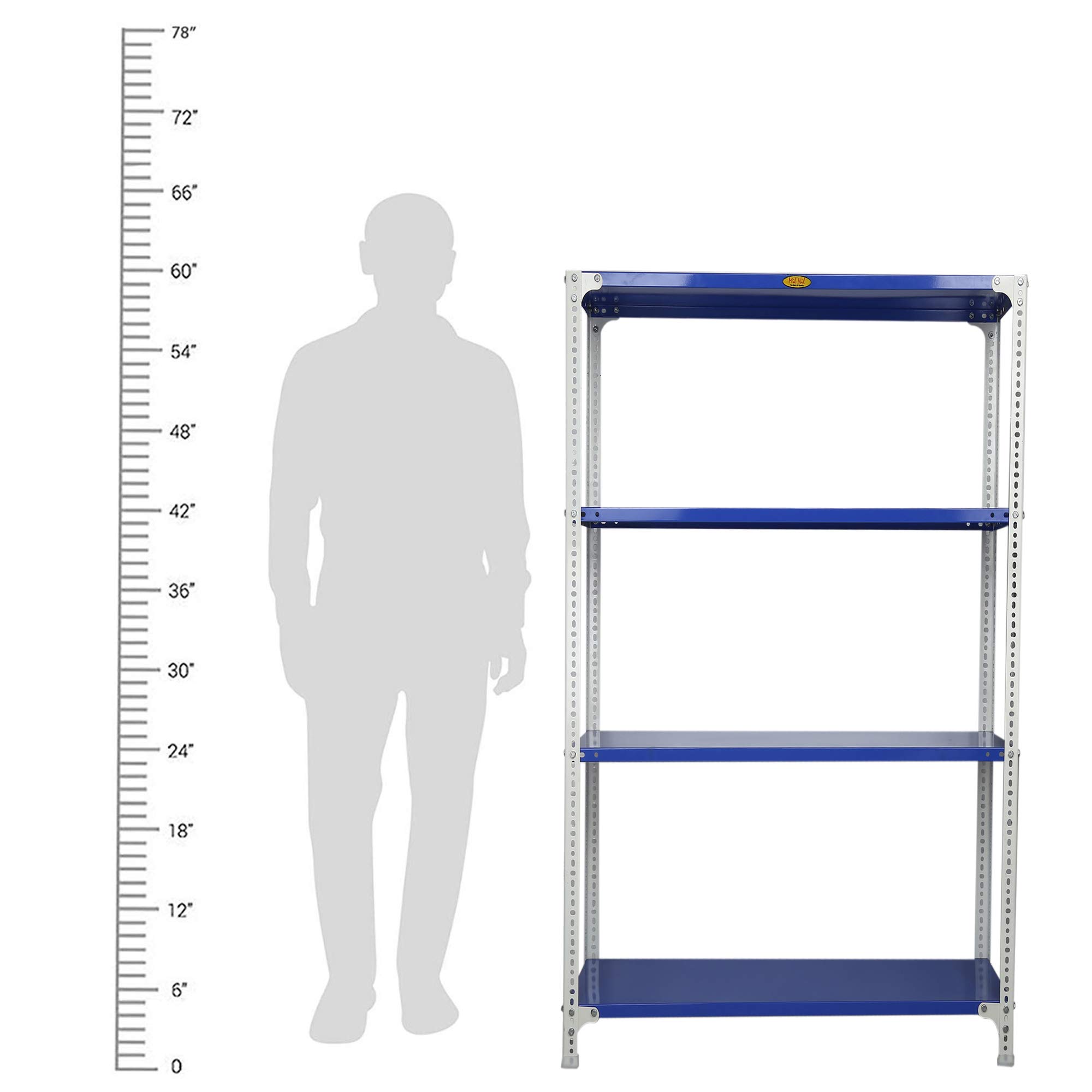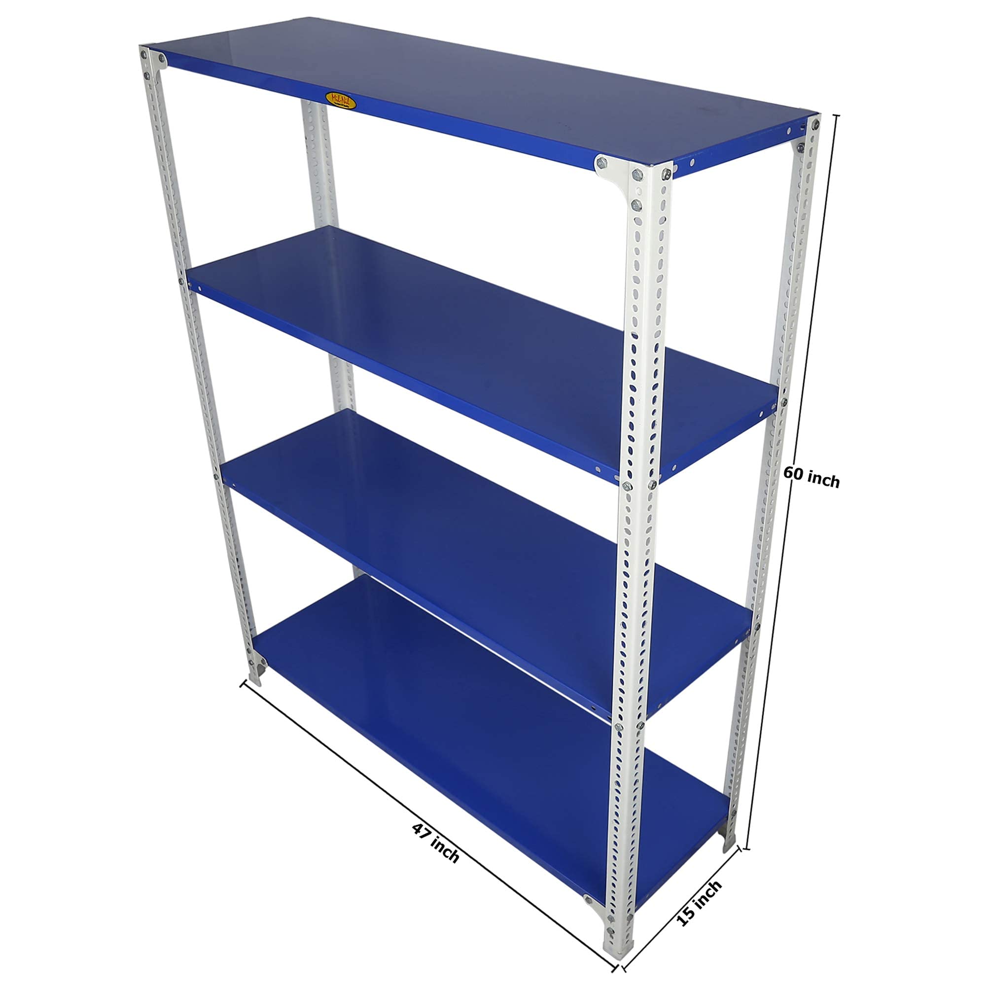 Item NameMil-Nil Prime CRC Sheet 4 Shelf Multipurpose Slotted Angle Rack, 60 x 47 x 15 Inch, 18 Gauge [(Blue-White) Powder Coating] 14 Gauge Angles