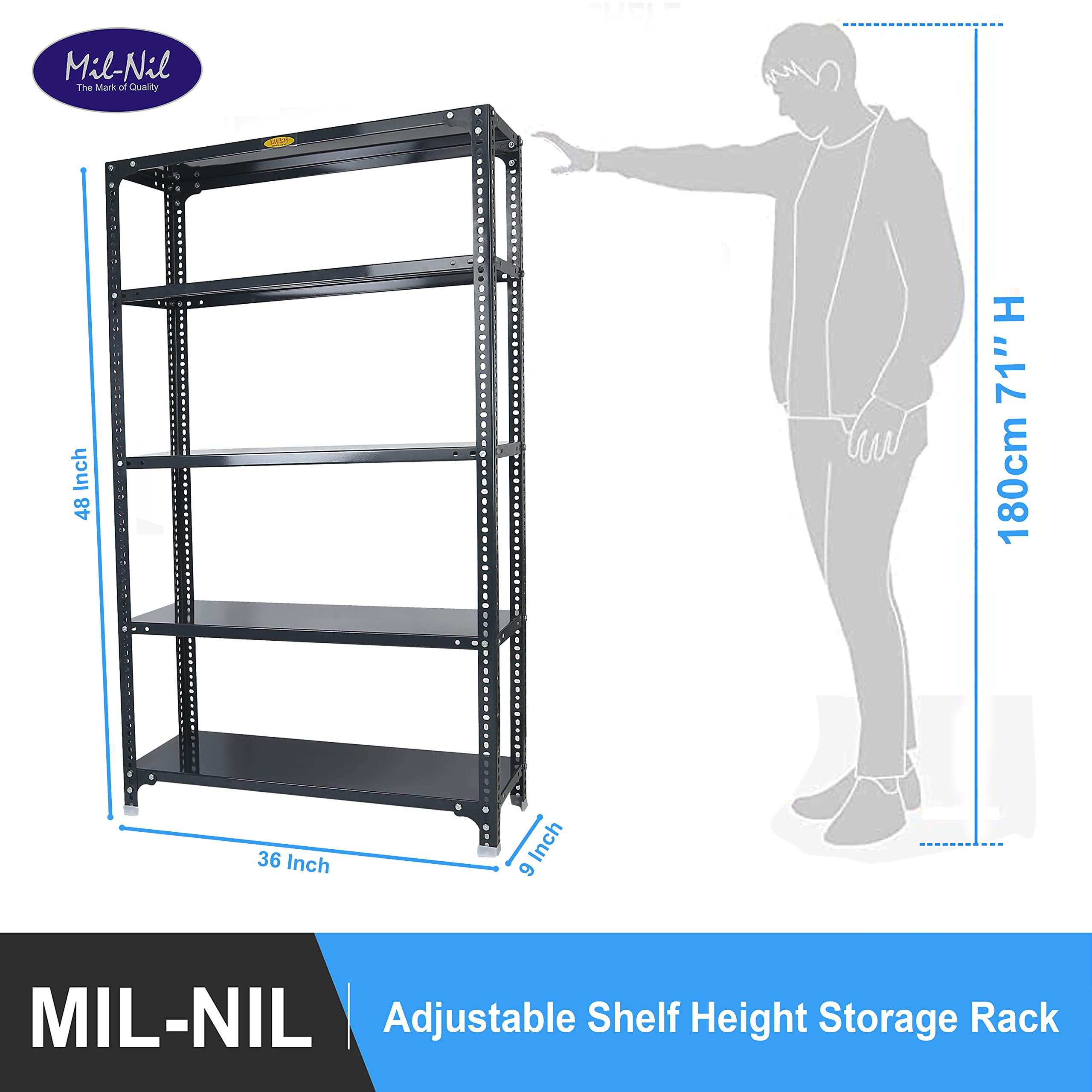 Item NameMil-Nil Prime CRC Sheet 5 Shelf 24 Gauge Multipurpose Slotted Angle Rack | Adjustable Shelf Hight for Home & Kitchen 18 Gauge Angle (48X36X9 inches, 11 Kg, Grey)