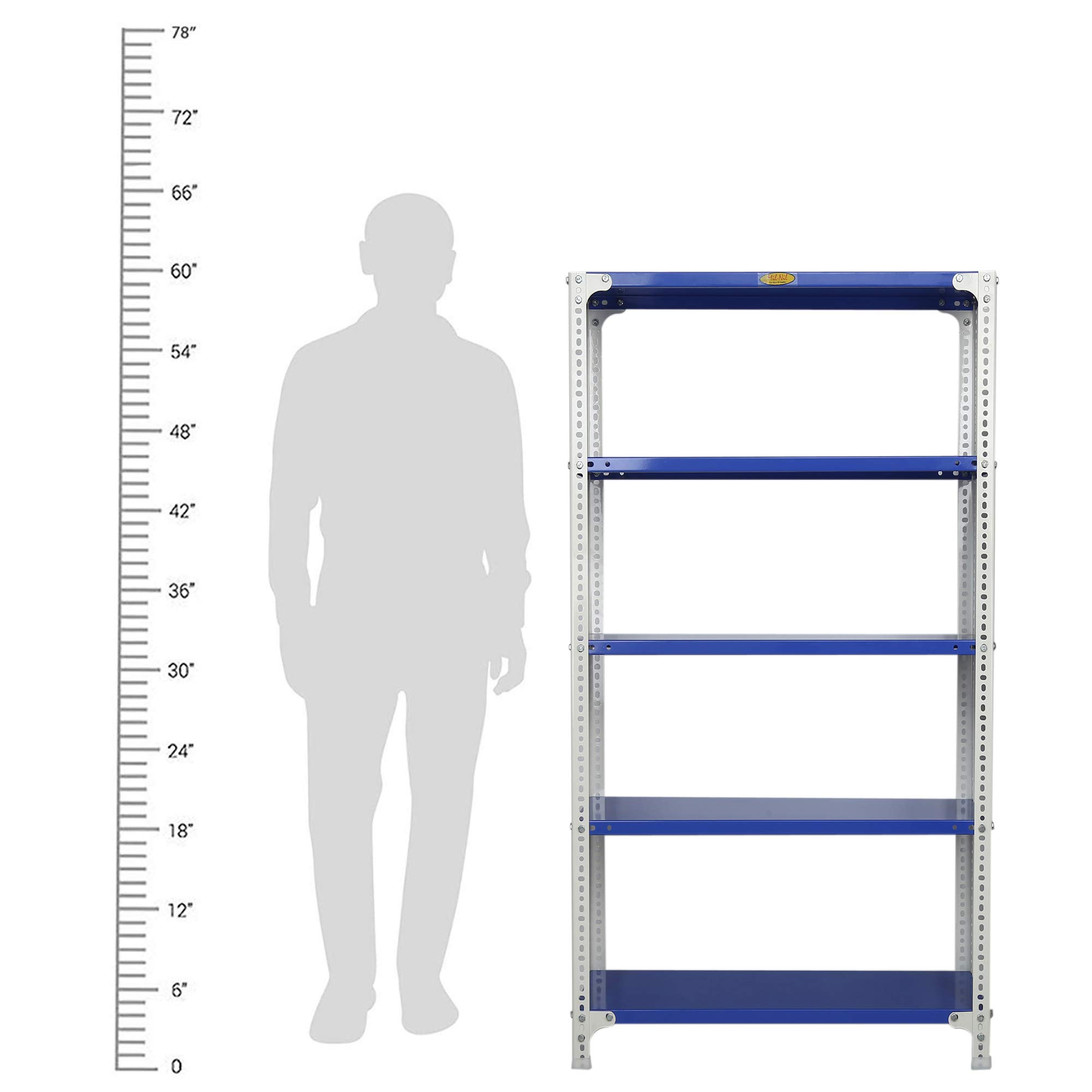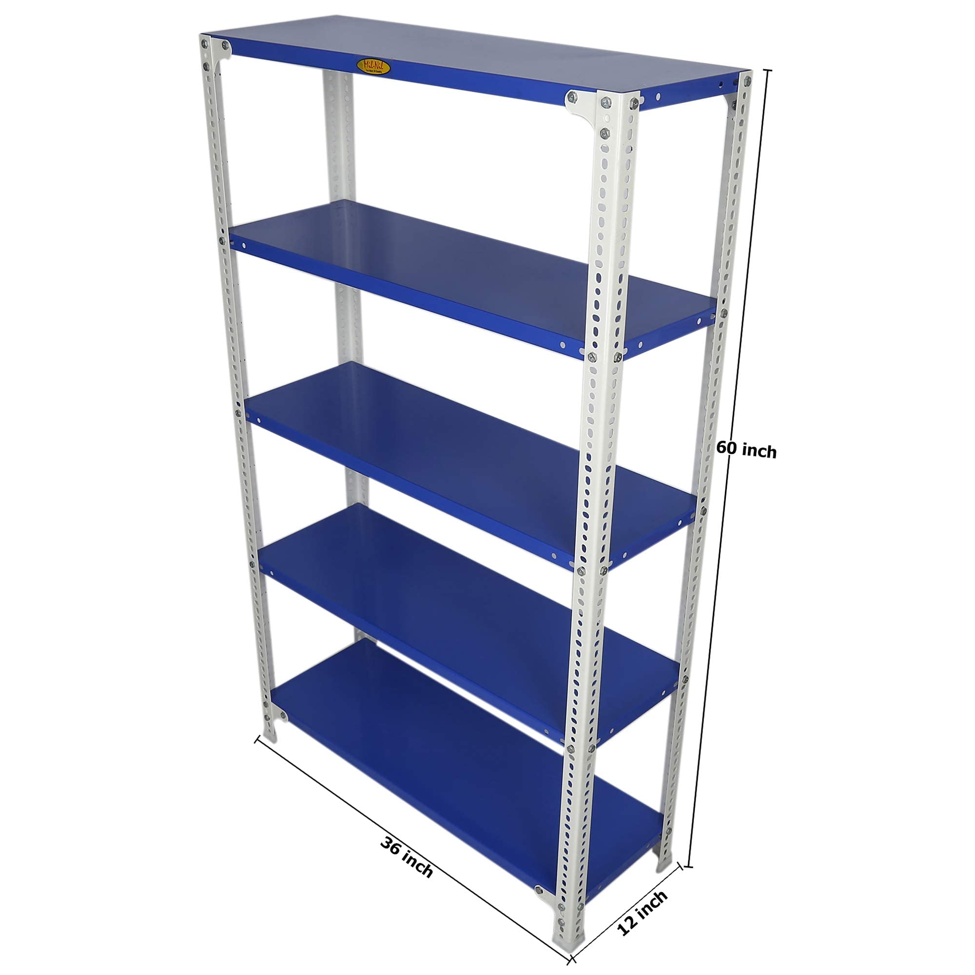 Item NameMil-Nil Prime CRC Sheet 5 Shelf Multipurpose Slotted Angle Rack, 60 x 36 x 12 Inch, 20 Gauge [(Blue-White) Powder Coating] 14 Gauge Angles