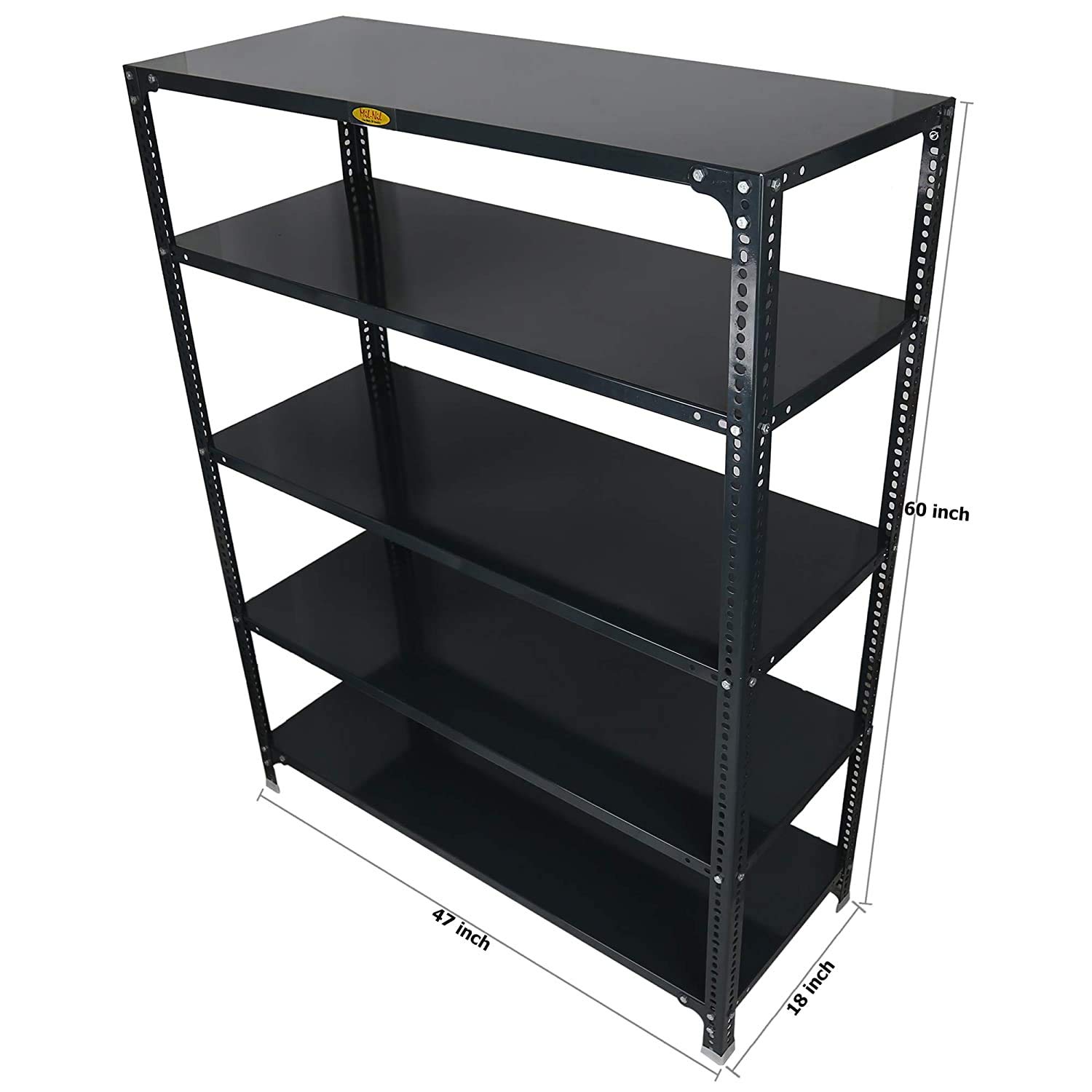 Item NameMil-Nil Prime CRC Sheet 5 Shelf Multipurpose Slotted Angle Rack, 60 x 47 x 18 Inch, 18 Gauge (Grey) 14 Gauge Angles