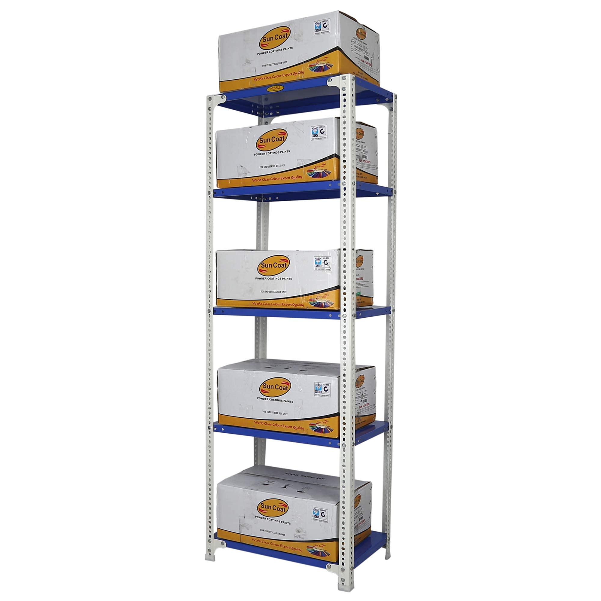 Item NameMil-Nil Prime CRC Sheet 5 Shelf Multipurpose Slotted Angle Rack, 72 x 24 x 15 Inch, 24 Gauge [(Blue-White) Powder Coating] 16 Gauge Angles
