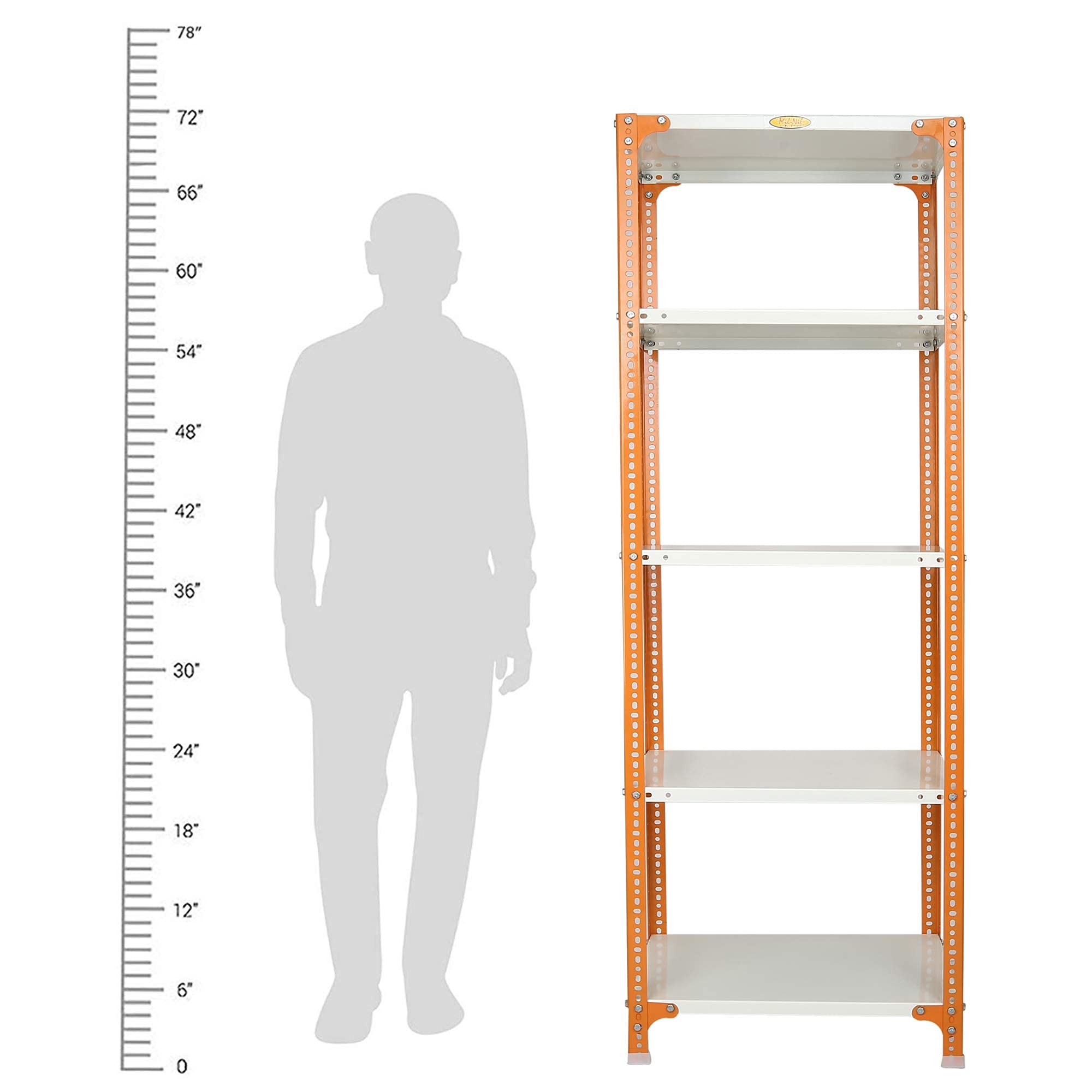Item NameMil-Nil Prime CRC Sheet 5 Shelf Multipurpose Slotted Angle Rack, 72 x 24 x 18 Inch, 24 Gauge [(Orange-Ivory) Powder Coating] 16 Gauge Angles