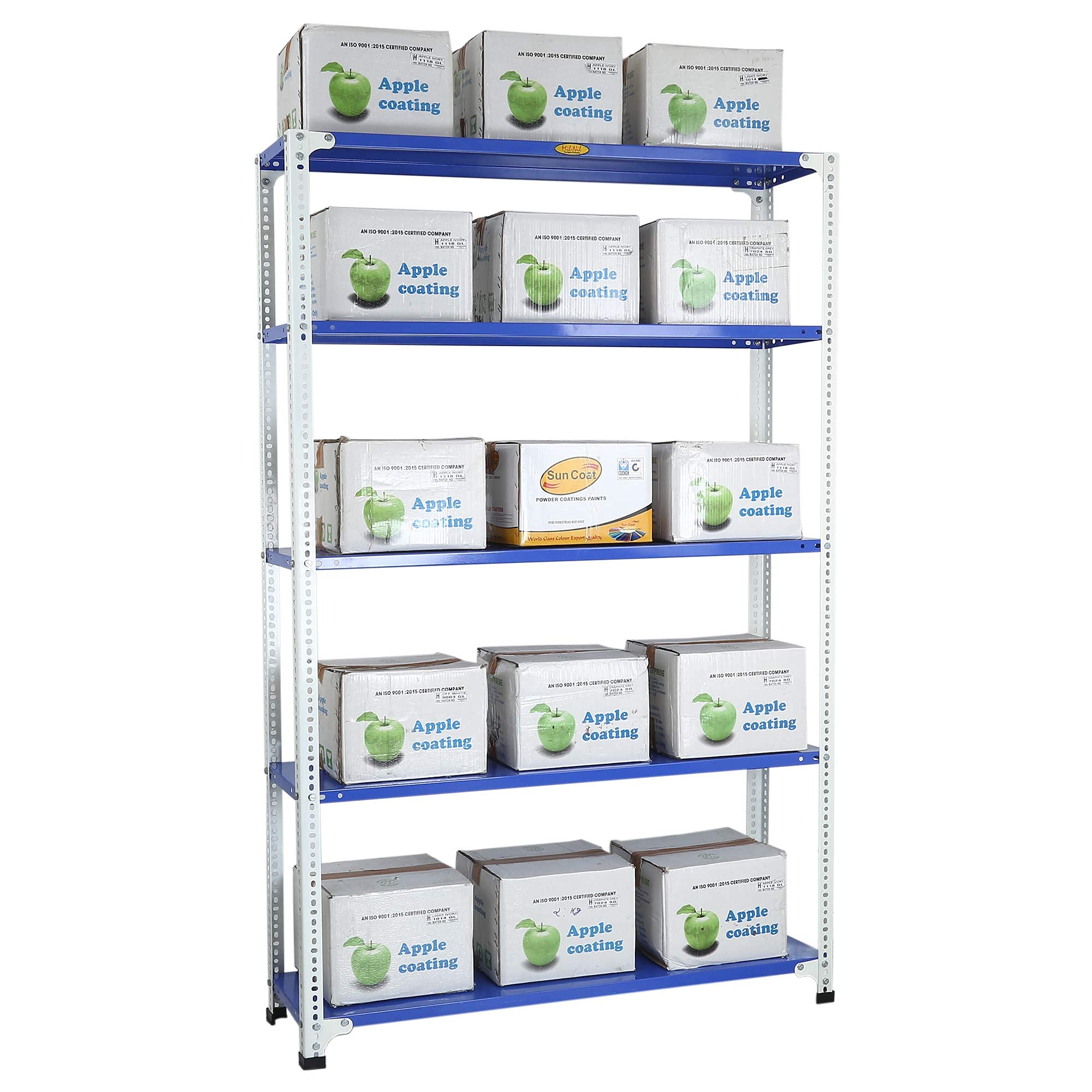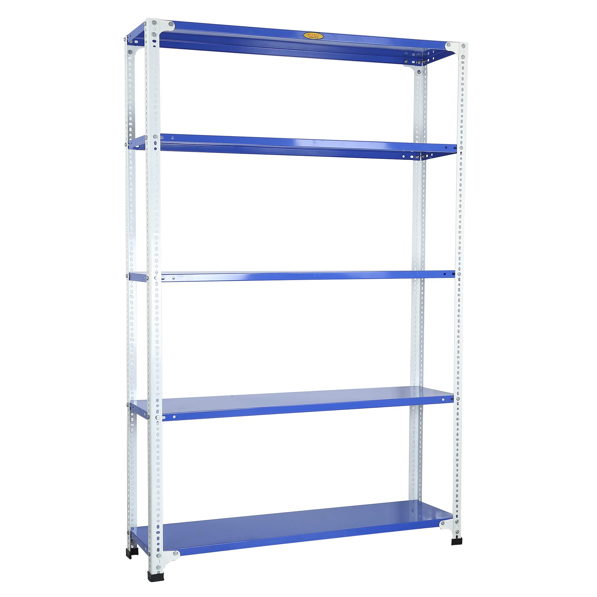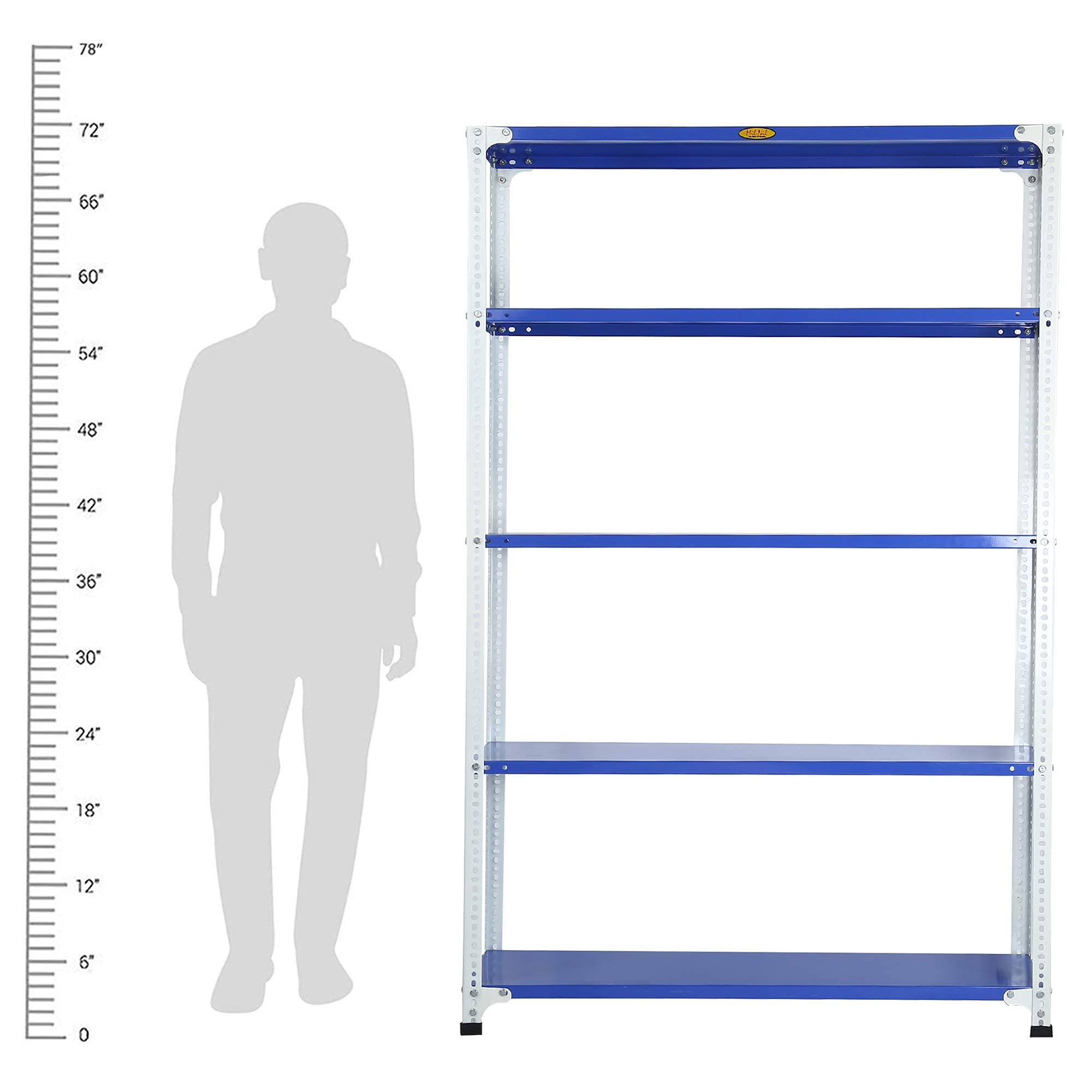 Item NameMil-Nil Prime CRC Sheet 5 Shelf Multipurpose Slotted Angle Rack, 72 x 47 x 12 Inch, 18 Gauge (Blue-White) Powder Coated 14 Gauge Angles