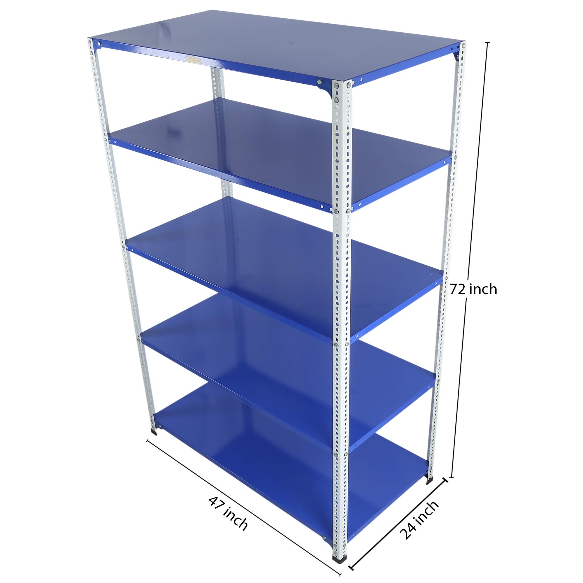 Item NameMil-Nil Prime CRC Sheet 5 Shelf Multipurpose Slotted Angle Rack, 72 x 47 x 24 Inch, 18 Gauge (Blue-White) Powder Coated 14 Gauge Angles
