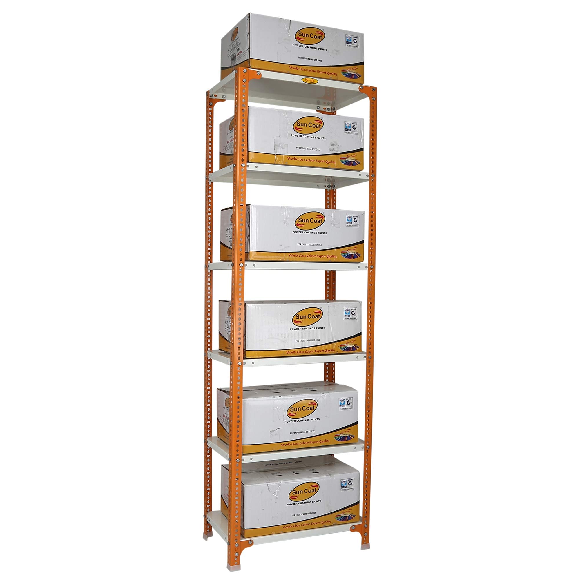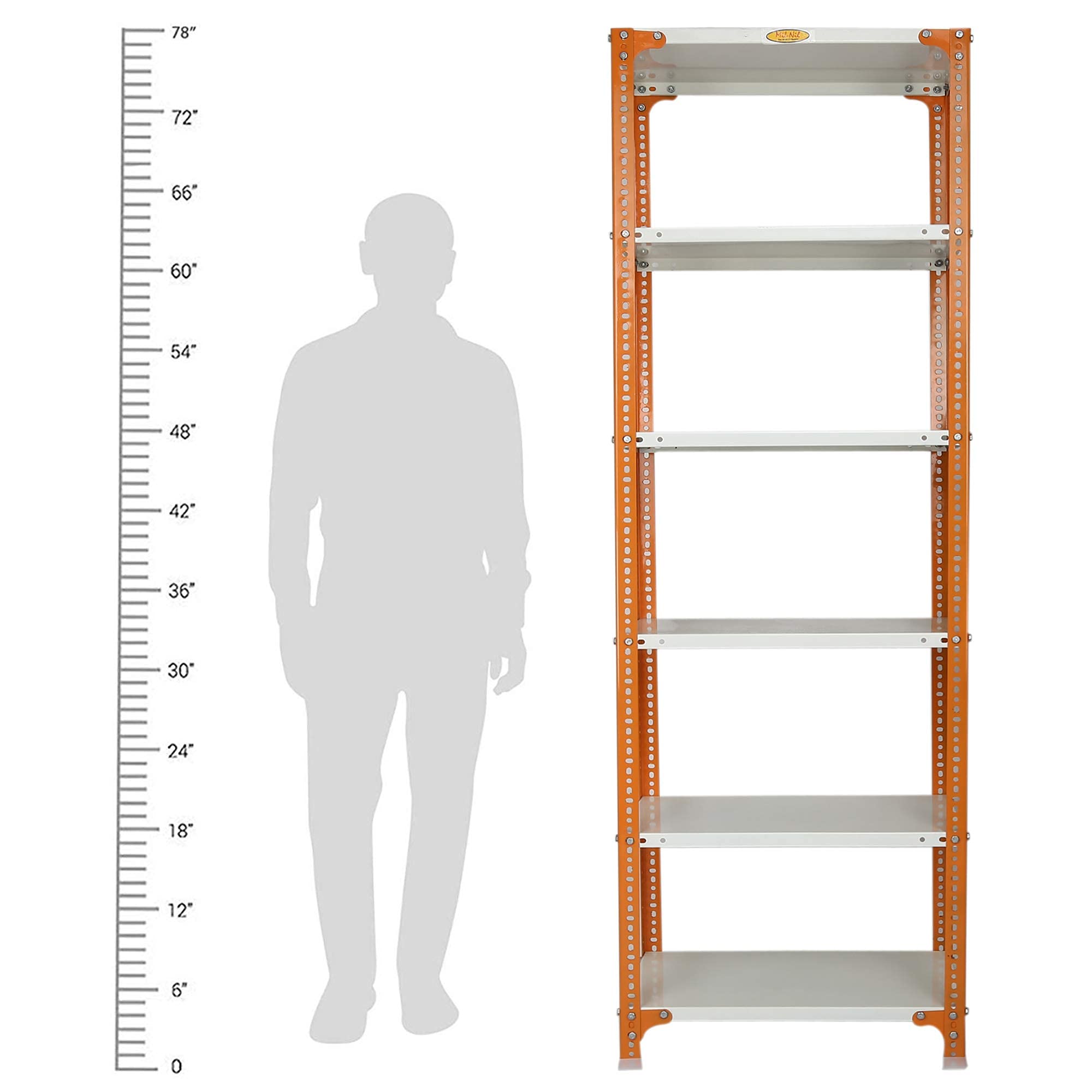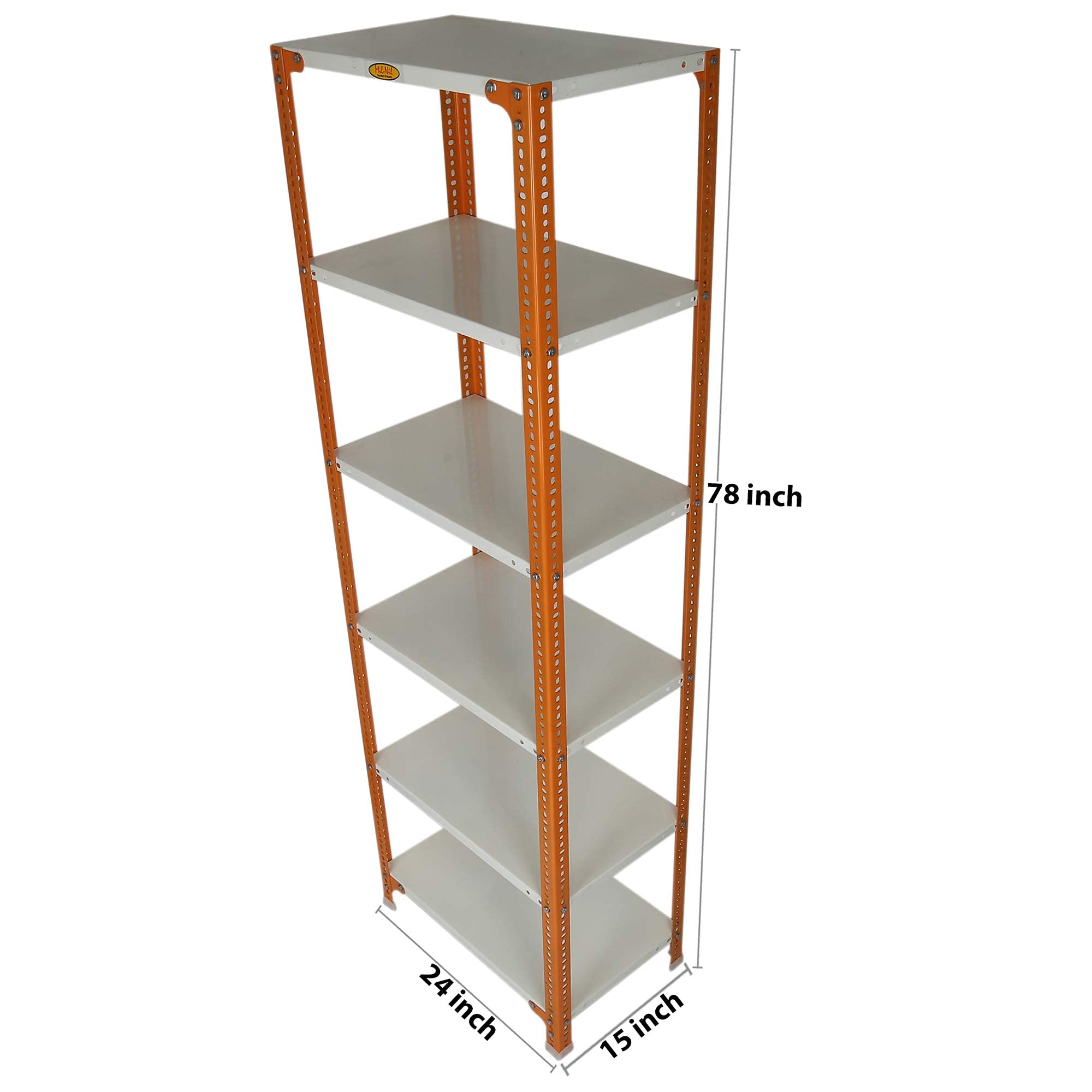 Item NameMil-Nil Prime CRC Sheet 6 Shelf Multipurpose Slotted Angle Rack, 78 x 24 x 15 Inch, 24 Gauge [(Orange-Ivory) Powder Coating] 16 Gauge Angles