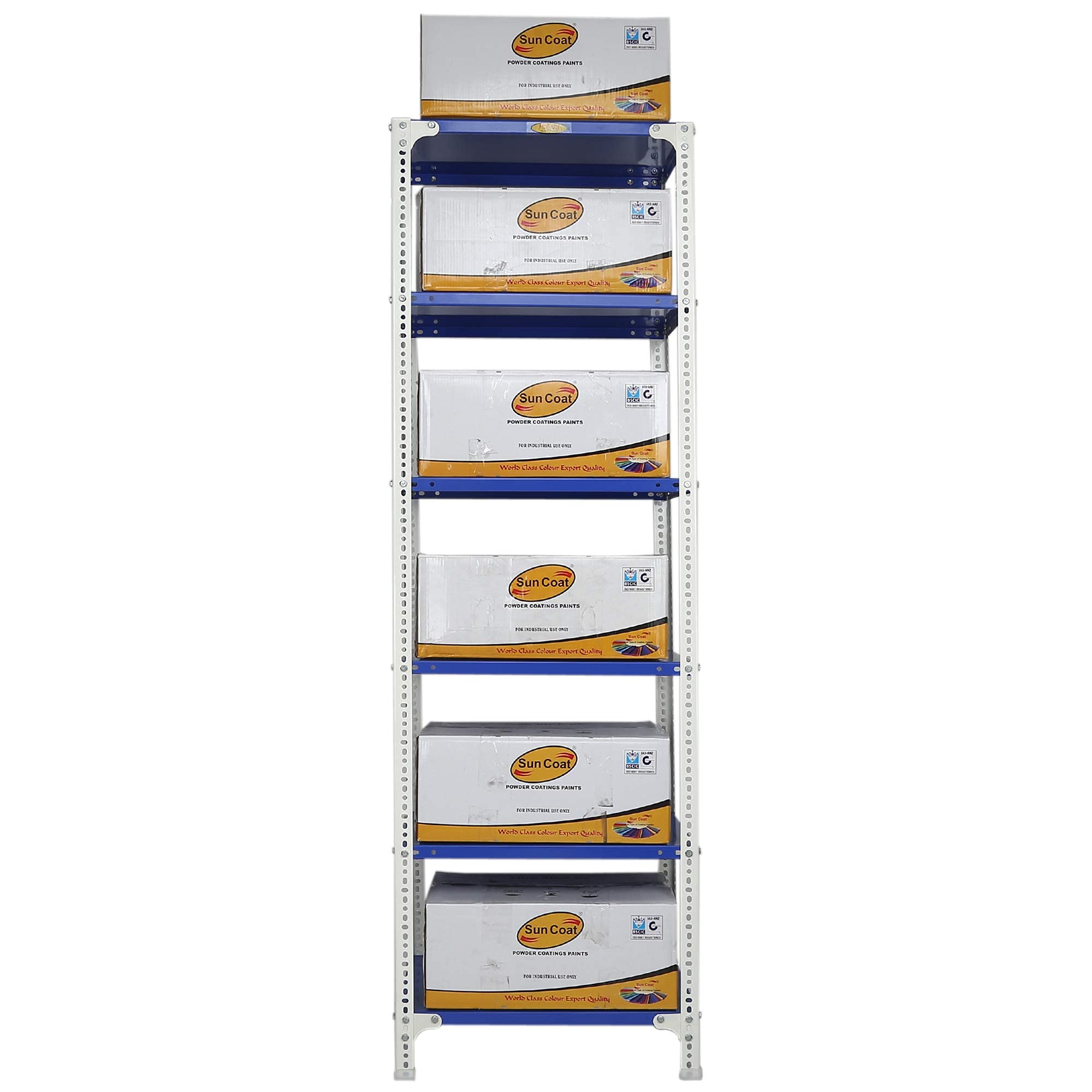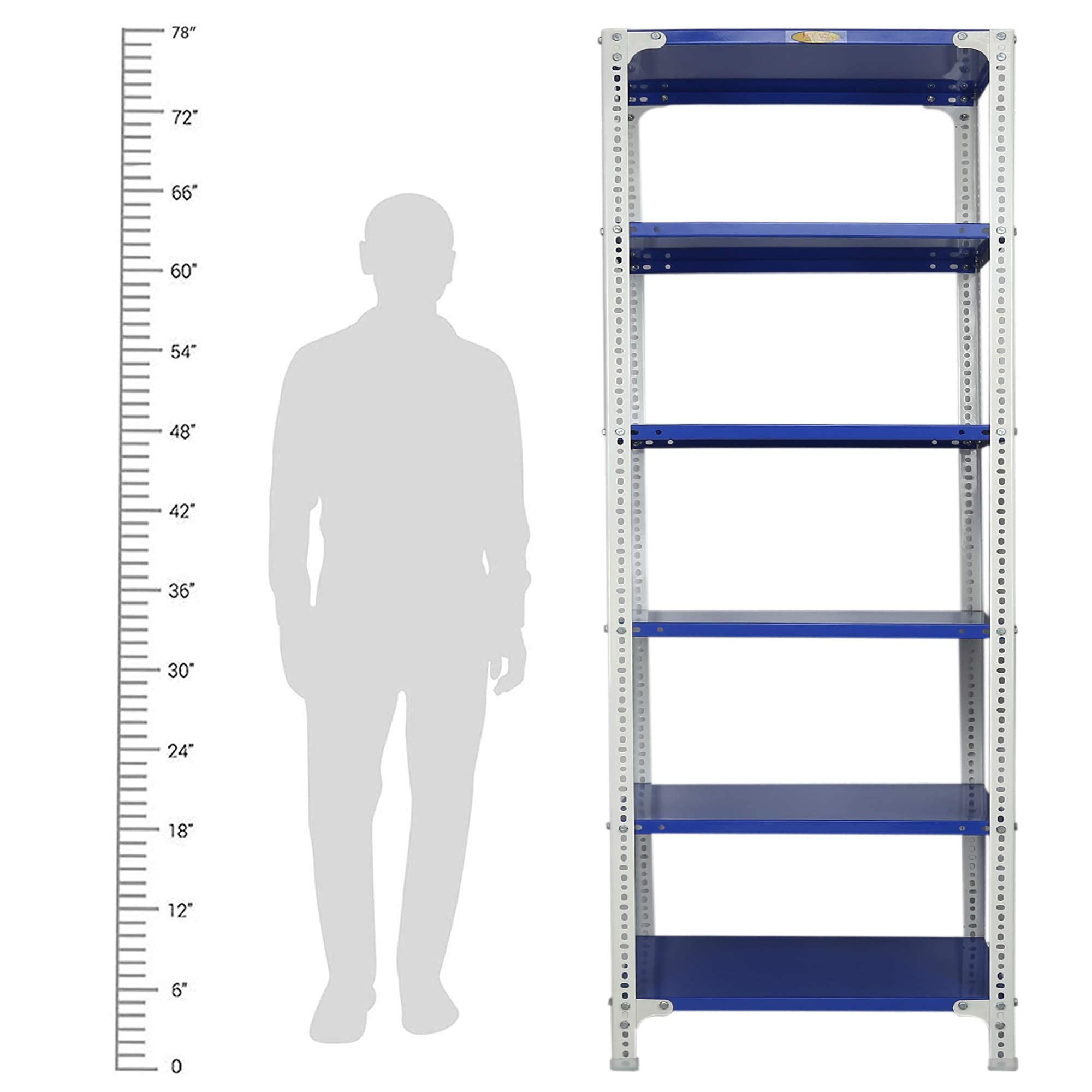 Item NameMil-Nil Prime CRC Sheet 6 Shelf Multipurpose Slotted Angle Rack, 78 x 24 x 18 Inch, 24 Gauge [(Blue-White) Powder Coating] 16 Gauge Angles
