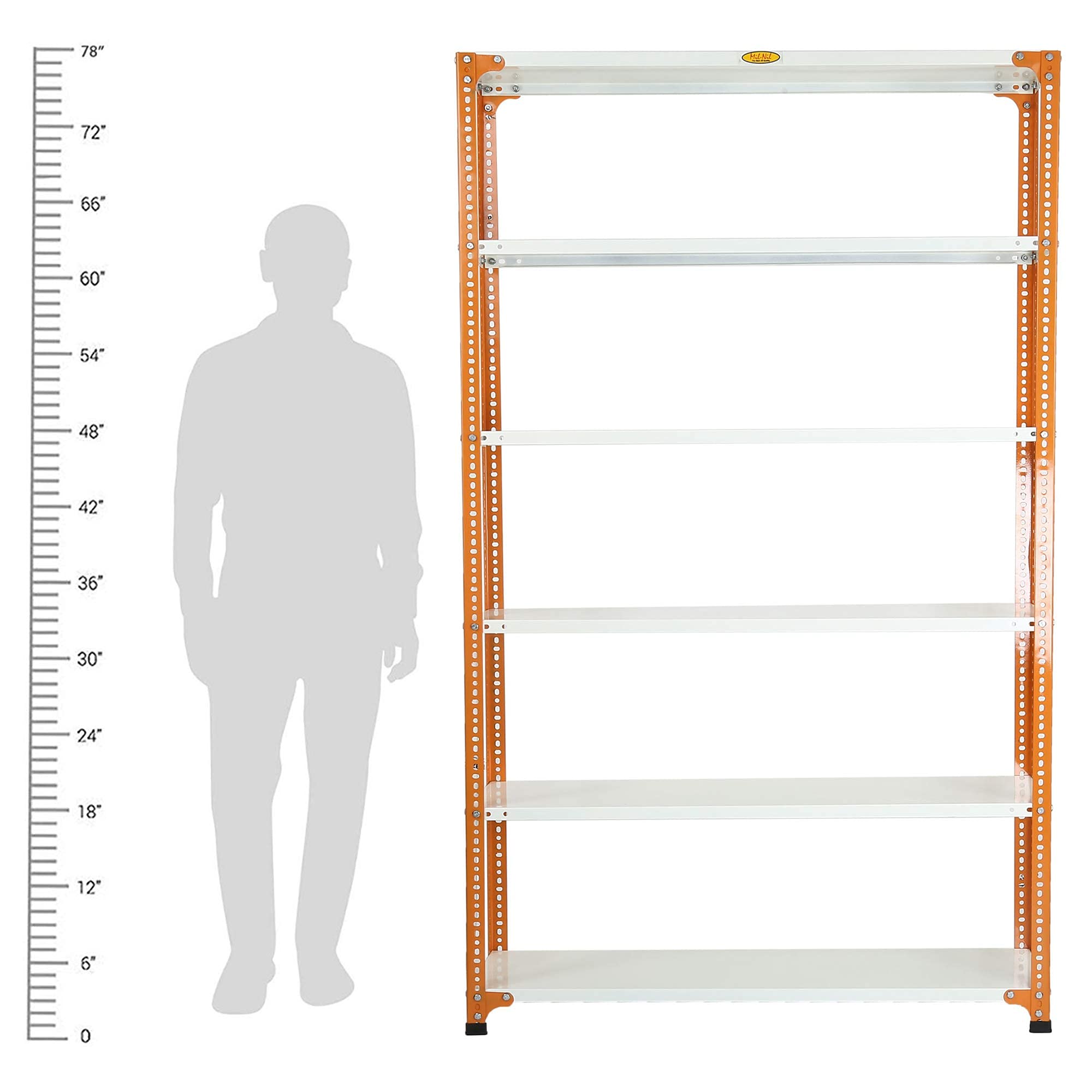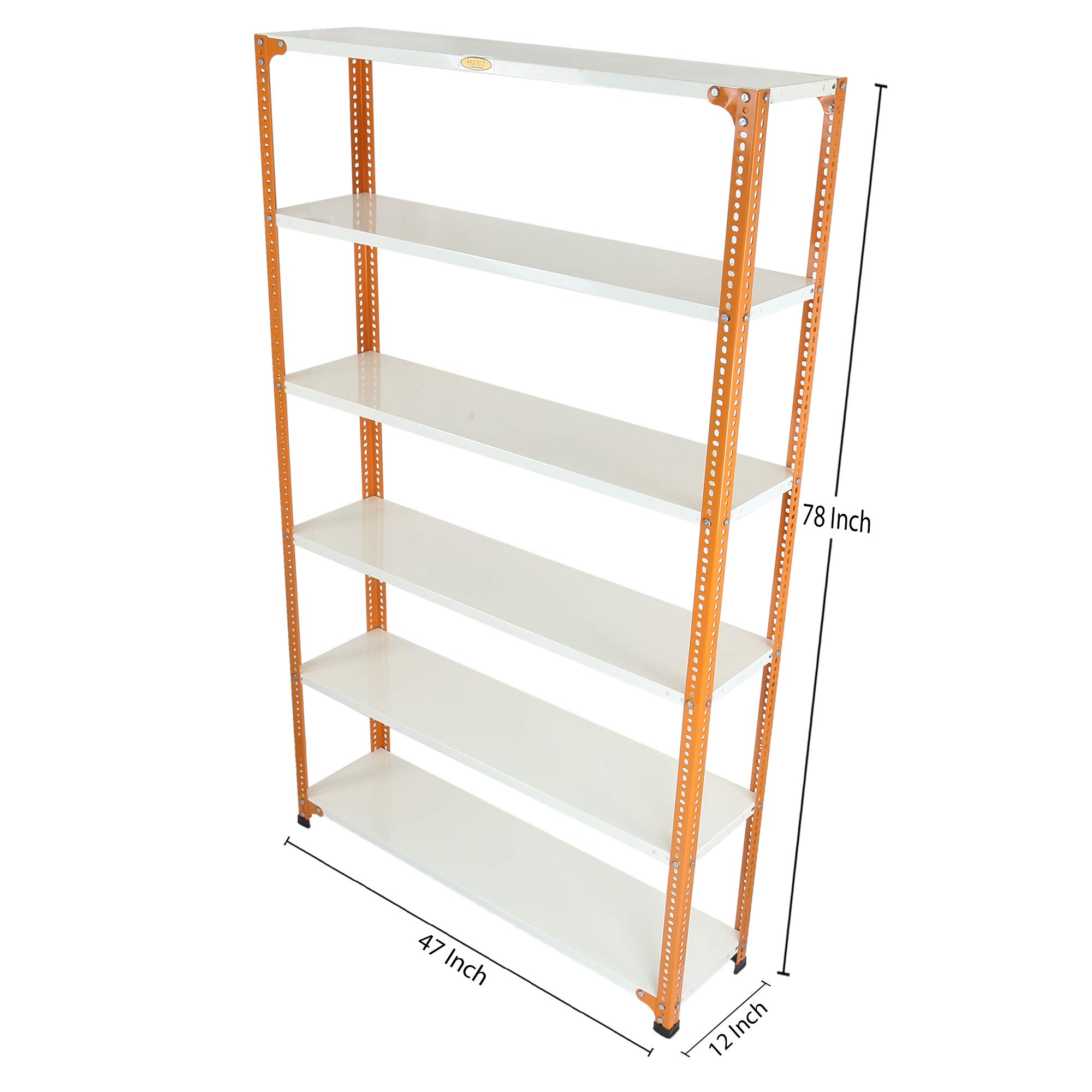 Item NameMil-Nil Prime CRC Sheet 6 Shelf Multipurpose Slotted Angle Rack, 78 x 47 x 12 Inch (24 Gauge, Orange) 16 Gauge Angles