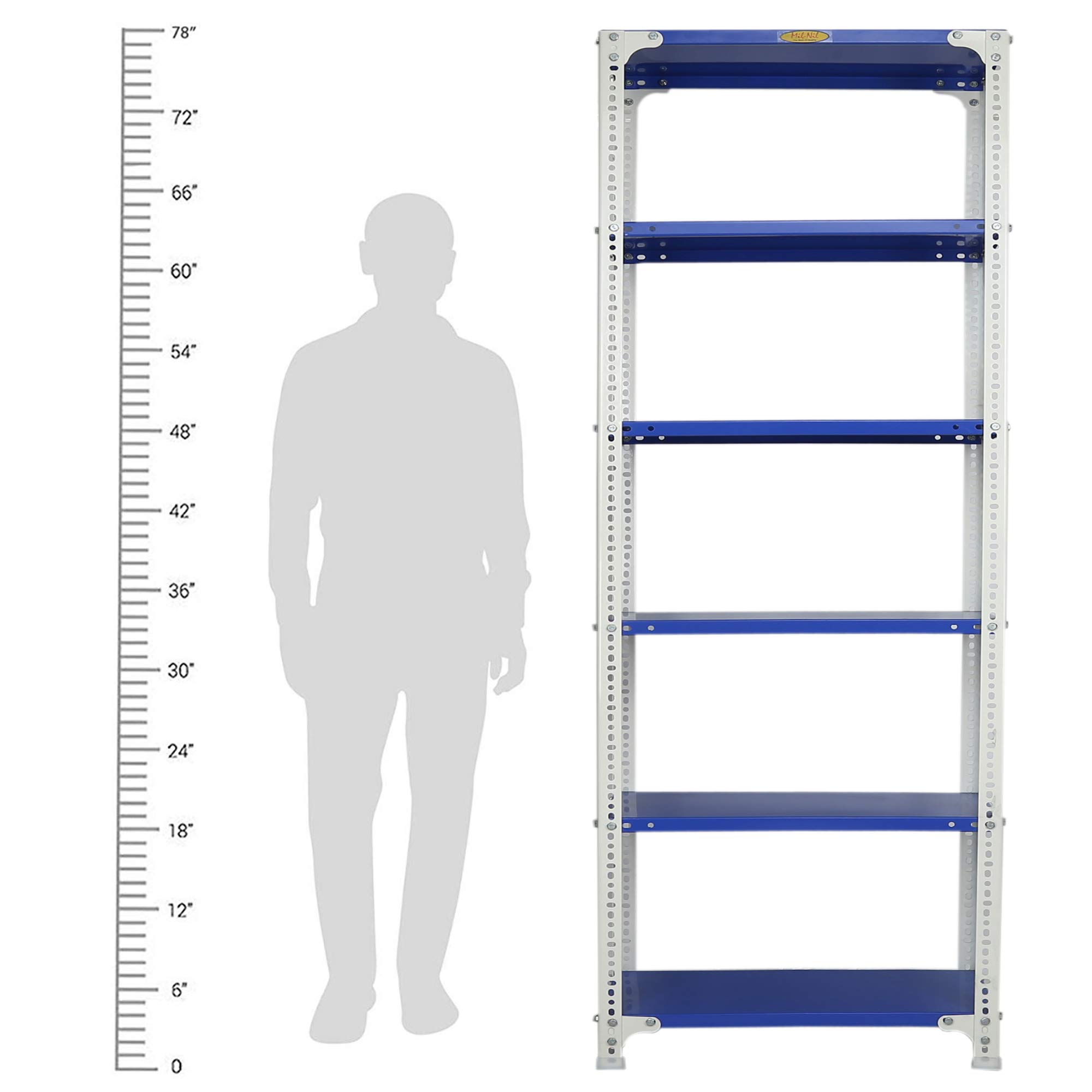 Item NameMil-Nil Prime CRC Sheet 78X30X12 Inch Multipurpose Storage, Adjustable Shelf, Slotted Angle Rack with 6 Shelves 22 Gauge_Blue/White 16 Gauge Angles